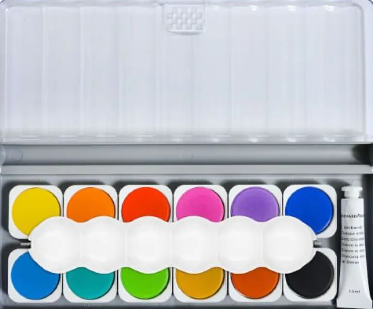 Hergestellt aus 51% recyceltem Material. Leuchtende Farben. Transparenter Deckel – einfach abnehmbar, inkl. herausnehmbarer Mischpalette, 12 auswechselbare Farbtabletten