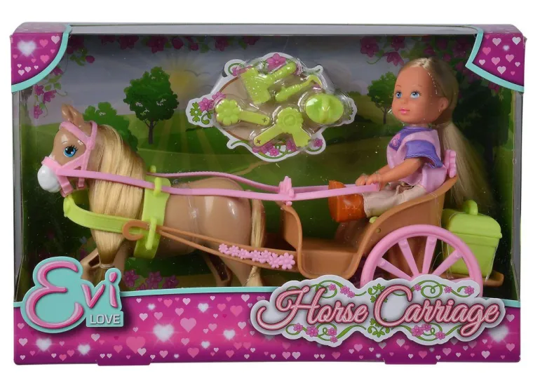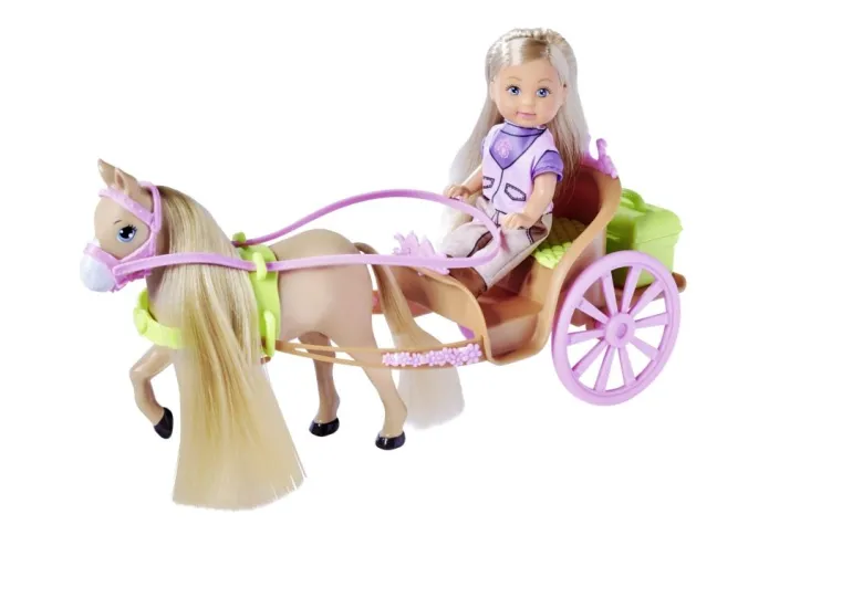 Evi sitzt in ihrer Pferdekutsche mit Pferd, inkl. Zubehör und Geheimfach in der Kutsche, L:28cm