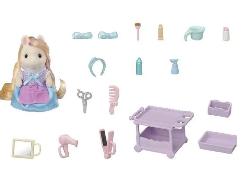 Die Sylvanian Families Pony Mutter Serafina ist eine sehr gute Friseurin. Das ist ihre Leidenschaft und sie liebt es, ihre Kunden mit einer neuen Frisur glücklich zu machen. Auf ihrem Friseurwagen hat sie alles, was man braucht, um schöne Frisuren zu zaubern. Shampoo, Pflegeprodukte, Glätteisen, Kamm, Spiegel und vieles mehr. Die Schere und den Kamm kann sie in ihrer Friseurschürze aufbewahren. Mit den Haarspangen kann sie jeder Frisur noch ein Highlight geben.