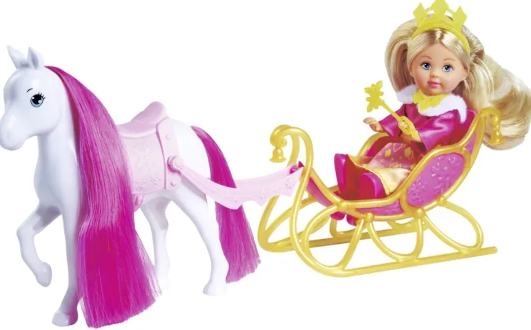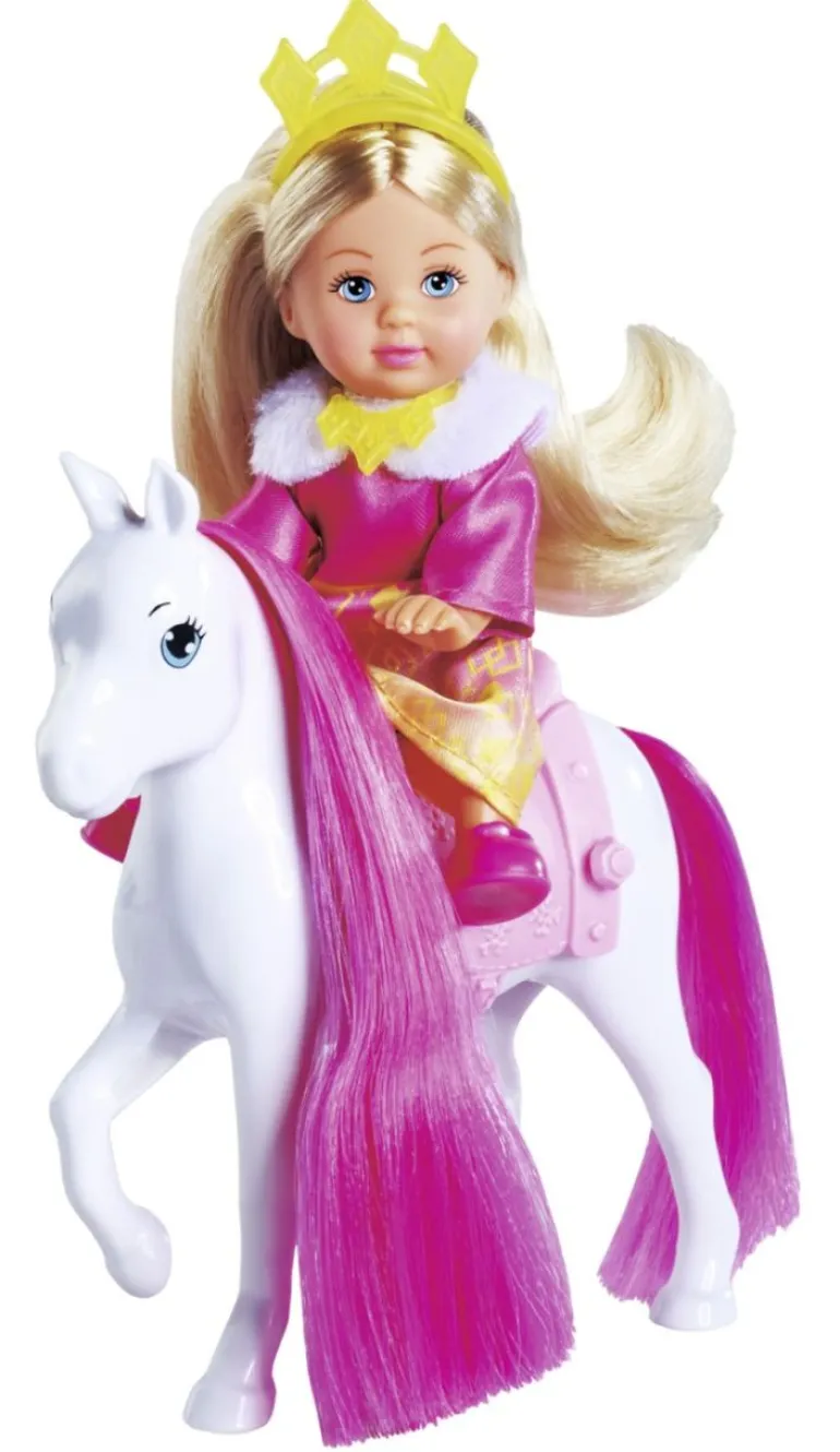 • Evi LOVE, die kleine Schwester von Steffi LOVE, liebt Mode und Tiere und hat viele verschiedene Hobbys. Evi LOVE Princess Ride trägt ein rosa-gelbes Kleid mit Fellapplikationen am Kragen • Tierische Begleitung – Evi sitzt in einer Kutsche, die von einem Pferd mit langer, pinker Mähne gezogen wird, welches auch von der Prinzessin auf einem Sattel geritten werden kann • Mit passenden Accessoires – Evis Look wird durch eine Krone, Halskette und einem Zepter vervollständigt • Altersempfehlung: Evi LOVE Princess Ride ist für Kinder ab 3 Jahren geeignet • Simba – Elefantenstarker Spielspaß! Im Zentrum der Produktentwicklung steht die Begeisterung der Kinder. Für Jungen und Mädchen, Klein und Groß. Kinder sollen Spaß haben und gefördert werden Mit Evi LOVE Princess Ride werden Märchen wahr! Die zauberhafte Prinzessin versprüht royalen Glanz und begeistert kleine Kinder. Evi erstrahlt als entzückende Prinzessin in einem atemberaubenden rosa-gelben Kleid mit Fellapplikationen am Kragen, die ihren königlichen Charme unterstreichen. Ihr majestätischer Look wird durch eine funkelnde Krone, eine zarte Halskette und einem königlichen Zepter perfektioniert. Auch ihr Fortbewegungsmittel ist in Evis Welt von höchstem Rang. Ihre prächtige Kutsche wird von einem niedlichen Pferd mit langer, pinker Mähne gezogen – und lässt jedes Mädchenherz höherschlagen. Evis Pferd ist mit einem Sattel ausgestattet, sodass die Prinzessin darauf reiten kann. Mit einer Größe von 12 cm ist Evi die perfekte Puppe zum Spielen und entführt Kinder ab 3 Jahren in ein märchenhaftes Reich voller Abenteuer.