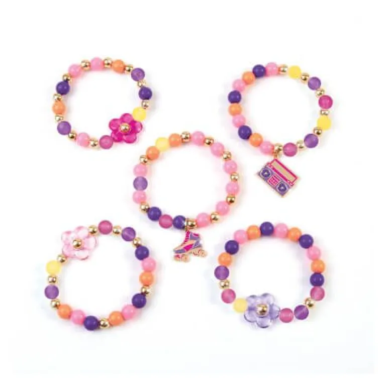 Set zum Herstellen von farbwechselnden Schmuck Armbändern. Inhalt: 1 transparente elastische Schnur (2 m), 23 farbwechselnde Perlen, 49 verschiedene Perlen , 39 Goldperlen, 3 Blumenanhänger, 2 Metallanhänger, 1 Anleitungsblatt, 1 Basteltablett. Sonnenlicht verändert die Farben von Weiss zu Rosa, Lila und Gelb.