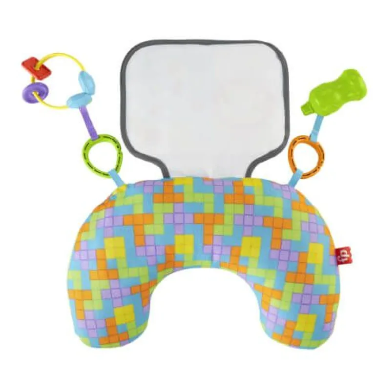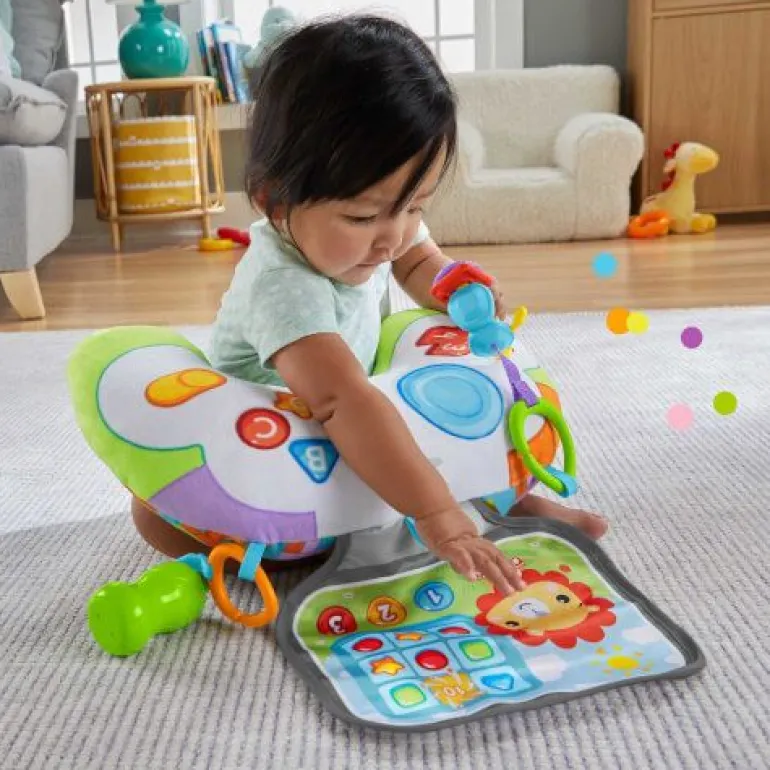 Das Babys Controller Spielkissen von Fisher-Price unterstützt das Spielen in der Bauchlage. Dieses weiche Spielkissen stützt Babys, während sie mit dem knisternden Bildschirm, den Kopfhörer-Klackerscheiben und der Energy-Drink-Rassel spielen, die am Spielkissen befestigt sind. Dies fördert die Grobmotorik des Kindes und erfreut dessen Sinne mit lustigen Geräuschen und Texturen in der Bauchlage.