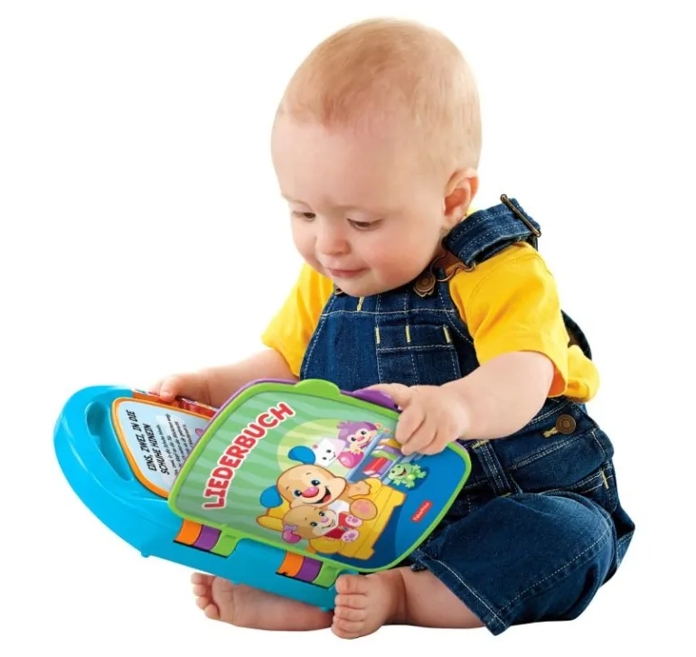 Blättert das Kind die Seiten um, sind beliebte Lieder wie “Backe backe Kuchen oder “Ich ruder auf dem See zu hören.