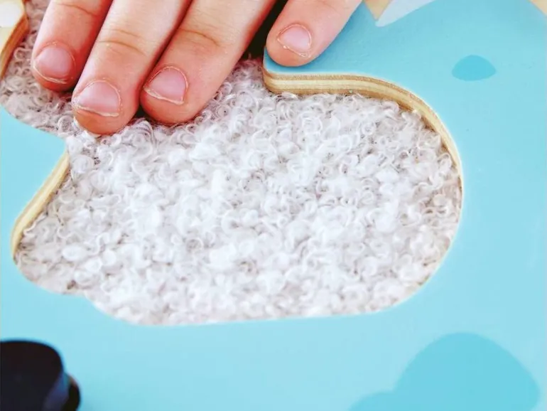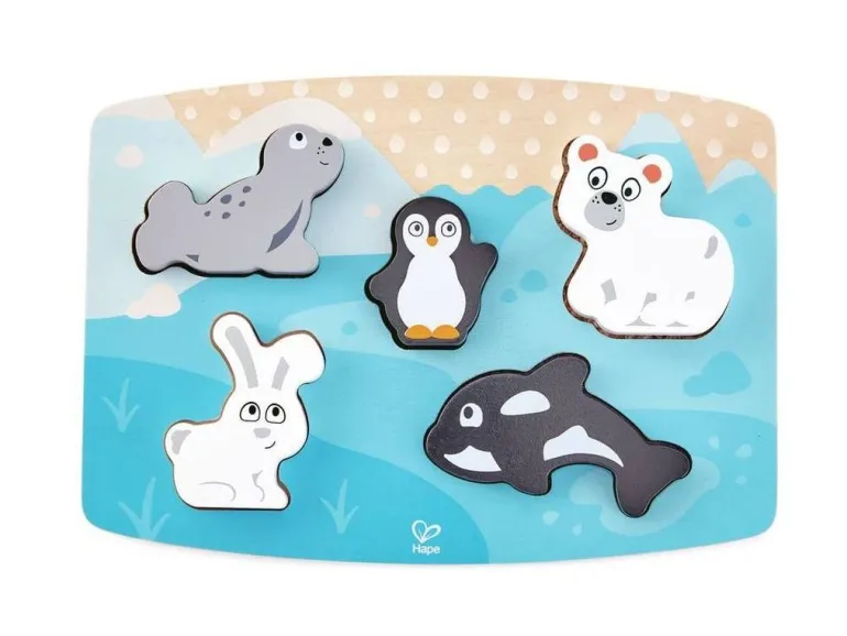 Es ist kalt in der Arktis und die Tiere brauchen ein besonderes Fell, um nicht zu frieren! Nimm die Teile aus dem Puzzle heraus und fühle das Fell von Robbe, Pinguin, Eisbär, Schneehase und Walfisch.
