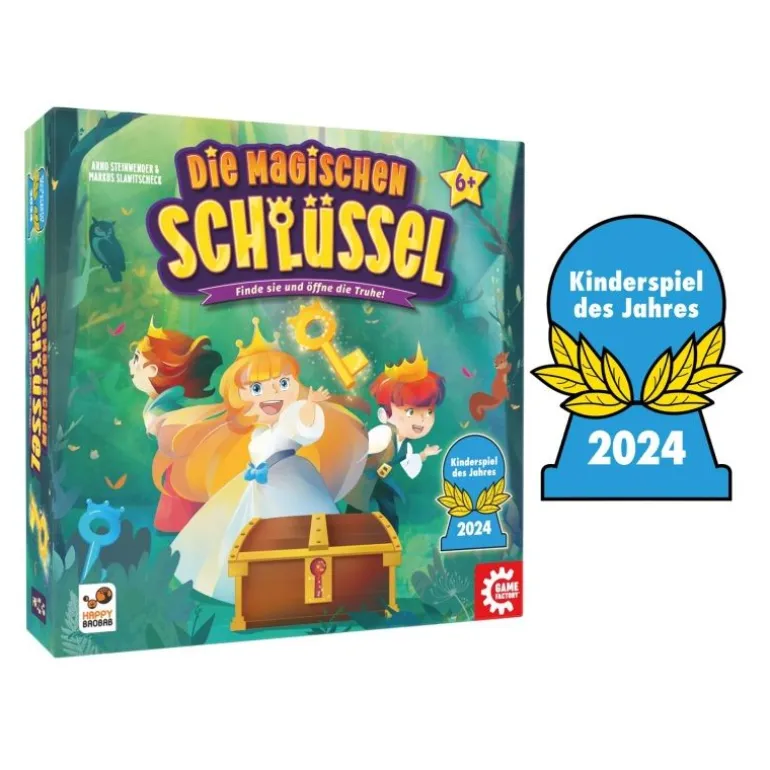 In diesem zauberhaften Kinderspiel würfeln sich 2-4 Spieler durch den magischen Schlüsselwald. In jedem Weg-Feld steckt zu Beginn ein Schlüssel – je weiter man in den Würfelwald eindringt, desto funkelnder die Belohnung. Der Weg durch den magischen Schlüsselwald birgt aber auch Risiken: Zeigen alle drei Würfel das Mond-Symbol, heißt es Gute Nacht und der Zug ist beendet. Wagt man also noch einen Würfelwurf oder versucht man sein Glück mit diesem Schlüssel? Manche Schlüssel öffnen die Truhe, andere wiederum passen nicht in das Schloss … die Spannung steigt!