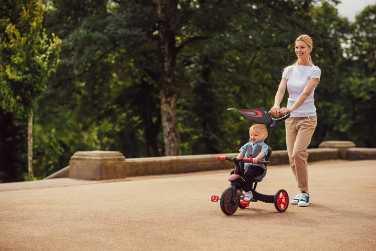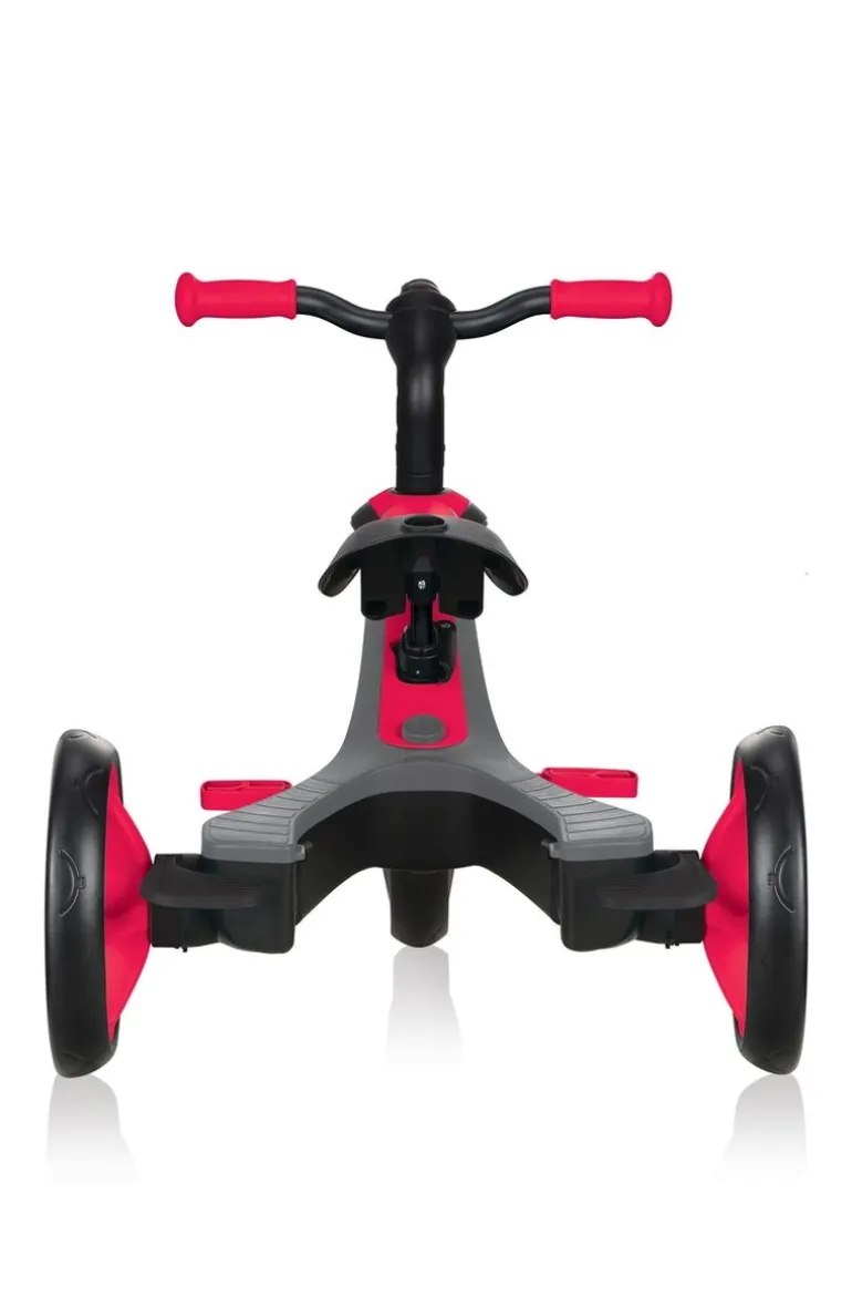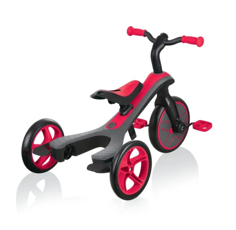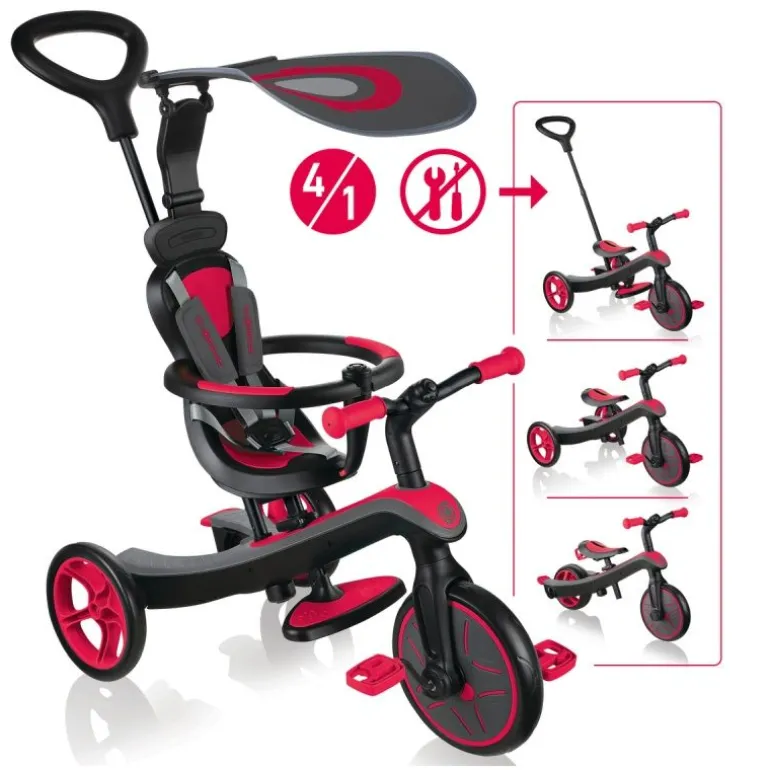 EXPLORER TRIKE 4 in 1 ist ein innovatives All-In-One Kinderfahrzeug mit patentiertem Umbau-System. Eltern können das EXPLORER TRIKE 4 in 1 leicht und zu 100 % werkzeuglos den Bedürfnissen des Kindes anpassen. Ob als Kinderwagen inklusive verstellbarem, abnehmbarem UV-Sonnenschutzdach (UPF 50+), Dreirad mit Schubstange, Dreirad oder Laufrad – das EXPLORER TRIKE 4 in 1 ist eine clevere Lösung für Eltern mit Kleinkindern, da das EXPLORER TRIKE 4 in 1 mit den Ansprüchen des Kindes mitwächst. – Fahrkomfort: Das EXPLORER TRIKE 4 in 1 sorgt im Kinderwagenmodus für eine bequeme und sichere Fahrt mit einem höhenverstellbaren TPR-Sicherheitssitz (32-35 cm), inklusive hoher Rückenlehne, Kopfstütze, Sicherheitsbügel und 5-Punkt Sicherheitsgurt mit Schulterpolstern. Die optimierte, extra breite Schubstange ist 2-fach höhenverstellbar (92-96 cm), abnehmbar und lässt sich den Bedürfnissen leicht anpassen. – Ist das nächste Level erreicht, punktet das EXPLORER TRIKE 4 in 1 im Dreirad- und Laufradmodus mit einem 2-fach höhenverstellbarem Sattel (31-34 cm) aus weichem, rutschfestem TPR und einer 2-farbigen Antirutsch-Sitzfläche. Höchsten Fahrkomfort in allen Fahrzeugmodi bieten die hochwertigen EVA-Reifen mit einer Vorderradgröße von 10 Zoll und einer Hinterradgröße von 8,5 Zoll. Zum Abstellen des EXPLORER TRIKE 4 in 1 kommt die optimierte Hinterradbremse zum Einsatz. – Sicherheit: Das eingebaute vordere Freilaufsystem mit Verriegelungs-/Entriegelungstaste ermöglicht es den kleinen Rennfahrern schnell und einfach die Kontrolle zu behalten. Ist es Zeit für eine Verschnaufpause, lassen sich die Füße bequem auf der extra breiten, abnehmbaren TPR-Fußstütze abstellen. Der BMX-Style Lenker ist mit farbigen, ergonomischen TPR-Sicherheitsgriffen ausgestattet und sorgt für bequeme und sichere Fahrten. – Das maximale Benutzergewicht beträgt 20 kg. Die Kinderwagenfunktion wird empfohlen für Kinder von 10-36 Monaten, die Dreiradfunktion mit Schubstange von 18-36 Monaten, die Dreiradfunktion von 24-36 Monaten und die Laufradfunktion von 2-5 Jahren. Wir als offizieller deutscher Globber-Partner bieten Ihnen einen umfassenden After-Sales-Service an sowie eine große Auswahl an Ersatzteilen unter