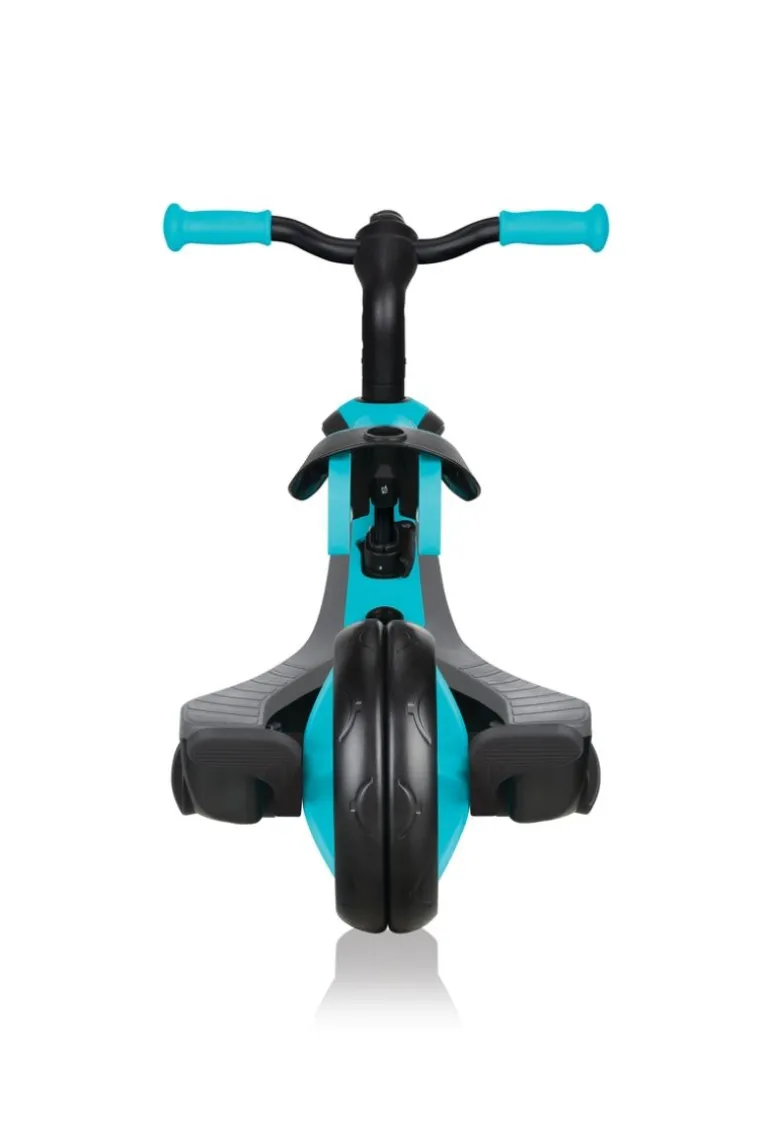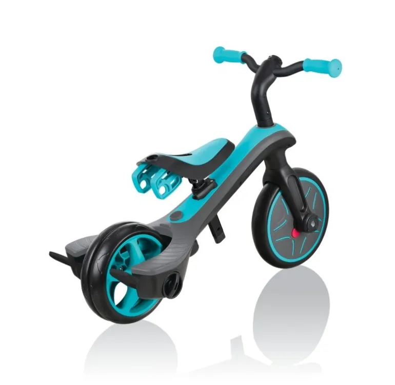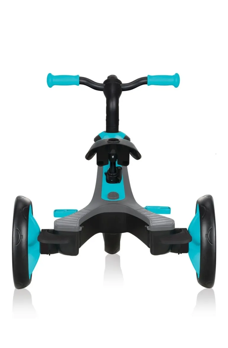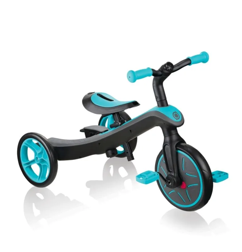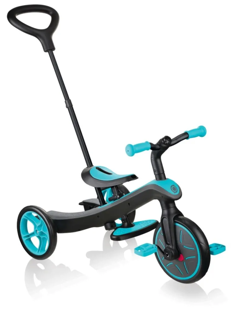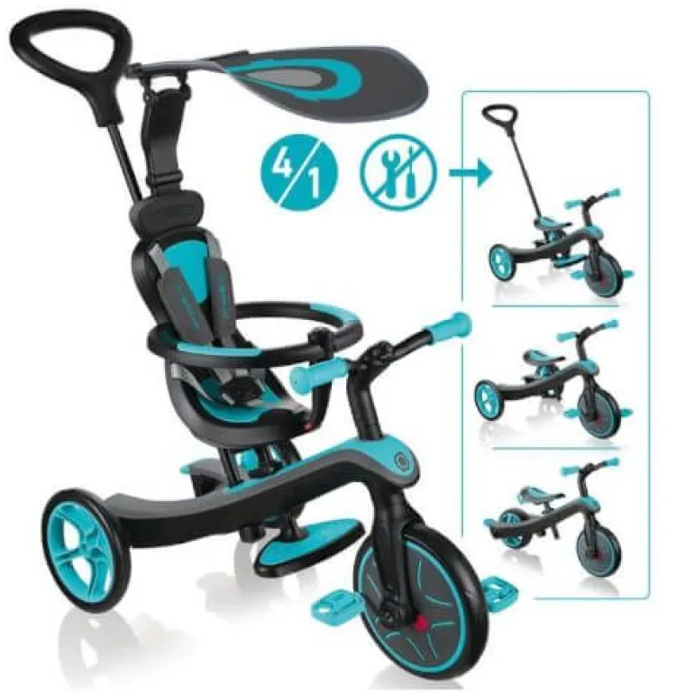 EXPLORER TRIKE 4 in 1 ist ein innovatives All-In-One Kinderfahrzeug mit patentiertem Umbau-System. Eltern können das EXPLORER TRIKE 4 in 1 leicht und zu 100 % werkzeuglos den Bedürfnissen des Kindes anpassen. Ob als Kinderwagen inklusive verstellbarem, abnehmbarem UV-Sonnenschutzdach (UPF 50+), Dreirad mit Schubstange, Dreirad oder Laufrad – das EXPLORER TRIKE 4 in 1 ist eine clevere Lösung für Eltern mit Kleinkindern, da das EXPLORER TRIKE 4 in 1 mit den Ansprüchen des Kindes mitwächst. – Fahrkomfort: Das EXPLORER TRIKE 4 in 1 sorgt im Kinderwagenmodus für eine bequeme und sichere Fahrt mit einem höhenverstellbaren TPR-Sicherheitssitz (32-35 cm), inklusive hoher Rückenlehne, Kopfstütze, Sicherheitsbügel und 5-Punkt Sicherheitsgurt mit Schulterpolstern. Die optimierte, extra breite Schubstange ist 2-fach höhenverstellbar (92-96 cm), abnehmbar und lässt sich den Bedürfnissen leicht anpassen. – Ist das nächste Level erreicht, punktet das EXPLORER TRIKE 4 in 1 im Dreirad- und Laufradmodus mit einem 2-fach höhenverstellbarem Sattel (31-34 cm) aus weichem, rutschfestem TPR und einer 2-farbigen Antirutsch-Sitzfläche. Höchsten Fahrkomfort in allen Fahrzeugmodi bieten die hochwertigen EVA-Reifen mit einer Vorderradgröße von 10 Zoll und einer Hinterradgröße von 8,5 Zoll. Zum Abstellen des EXPLORER TRIKE 4 in 1 kommt die optimierte Hinterradbremse zum Einsatz. – Sicherheit: Das eingebaute vordere Freilaufsystem mit Verriegelungs-/Entriegelungstaste ermöglicht es den kleinen Rennfahrern schnell und einfach die Kontrolle zu behalten. Ist es Zeit für eine Verschnaufpause, lassen sich die Füße bequem auf der extra breiten, abnehmbaren TPR-Fußstütze abstellen. Der BMX-Style Lenker ist mit farbigen, ergonomischen TPR-Sicherheitsgriffen ausgestattet und sorgt für bequeme und sichere Fahrten. – Das maximale Benutzergewicht beträgt 20 kg. Die Kinderwagenfunktion wird empfohlen für Kinder von 10-36 Monaten, die Dreiradfunktion mit Schubstange von 18-36 Monaten, die Dreiradfunktion von 24-36 Monaten und die Laufradfunktion von 2-5 Jahren. Wir als offizieller deutscher Globber-Partner bieten Ihnen einen umfassenden After-Sales-Service an sowie eine große Auswahl an Ersatzteilen unter