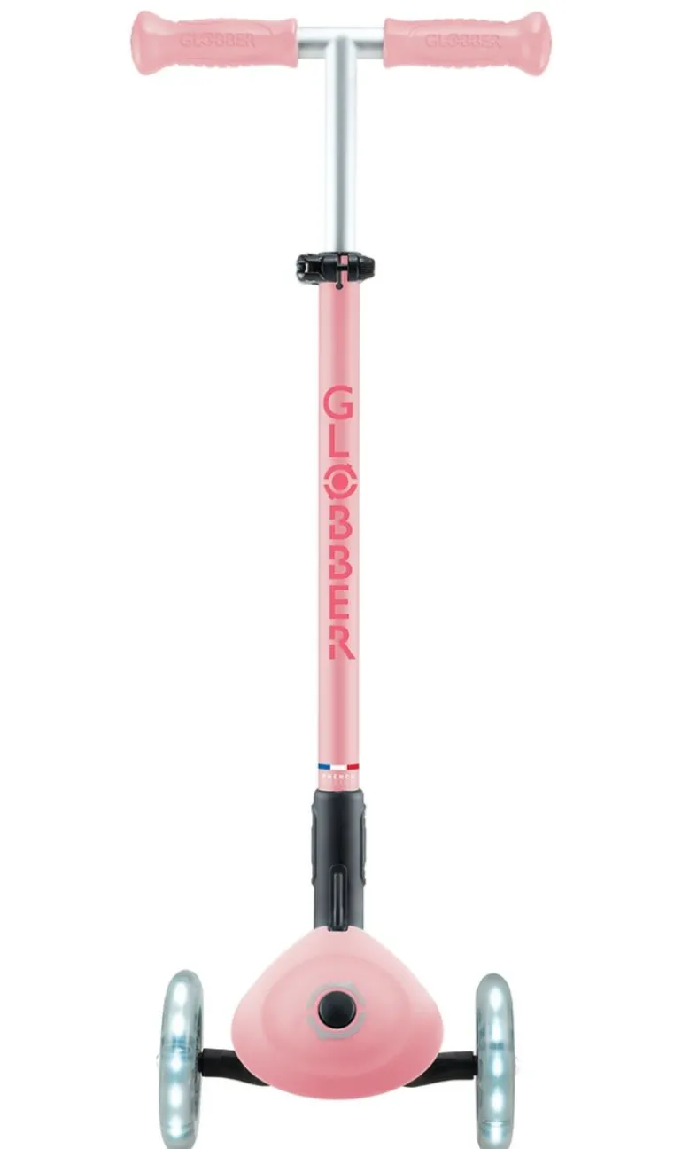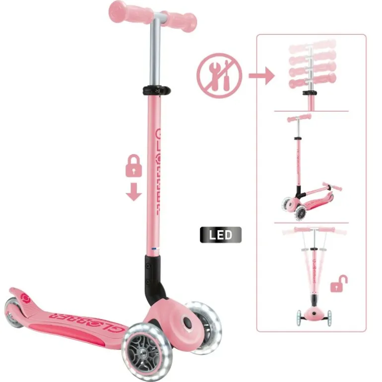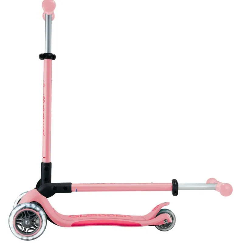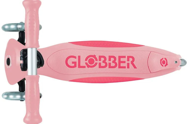 PRIMO FOLDABLE PLUS LIGHTS – Der 3-rädrige Kinderscooter mit leuchtenden Vorderrädern, patentiertem Klappmechanismus und Trolley-Modus, ist besonders beliebt bei Eltern, die Funktionalität und Sicherheit für ihre Kleinen suchen. PRIMO-Scooter sind die optimalen Roller für Kids, da sie mit der patentierten Lenkeinrastung die kleinen Profis von morgen beim Erlernen des Fahrens unterstützen und für sichere Fahrvergnügen sorgen. – Fahrkomfort: Mit einem Rollendurchmesser von 120 mm vorne/80 mm hinten, High Rebound, aus PU gegossen und einem ABEC 5 Kugellager ist maximaler Komfort garantiert. Die LED-Vorderräder des PRIMO FOLDABLE PLUS LIGHTS erzeugen während der Fahrt einen cool leuchtenden Effekt (Dynamo-Technologie) und sind ein echter Hingucker. Je schneller die Fahrt, desto heller leuchten die LED-Lichter – Fahrspaß pur! – Mehr Sicherheit: Die optimierte und extra breite Hinterradreibungsbremse sorgt auch bei rasanten Fahrten für ein sicheres Anhalten. Das extra tiefe, verstärkte Deck mit 2-farbiger Antirutsch-Trittfläche bietet optimalen Grip und einen sicheren Stand bei jeder Fahrt. Die patentierte, zuschaltbare Lenkeinrastung fixiert das Lenksystem der beiden Vorderräder, sodass sich der Scooter nur vorwärts und rückwärts bewegt. Auf diese Weise lernen die Kids sicher, einfach und schnell. – Fahrspaß für Groß und Klein: Die abnehmbare, farbig eloxierte Lenkstange aus Alu ist 4-fach höhenverstellbar zwischen 68-83 cm, inkl. Schnellspanner und Sicherheitsarretierung. So wächst der PRIMO FOLDABLE PLUS LIGHTS im Laufe der Zeit einfach mit! Der Lenker mit farbigen, ergonomischen TPR-Sicherheitsgriffen sorgt für ein komfortables Fahrerlebnis – ein Ausflug mit dem PRIMO FOLDABLE PLUS LIGHTS wird die Kids begeistern! – Das maximale Benutzergewicht beträgt 50 kg. Der Artikel wird empfohlen für Kinder ab 3 Jahren. Wir als offizieller deutscher Globber-Partner bieten Ihnen einen umfassenden After-Sales-Service an sowie eine große Auswahl an Ersatzteilen unter
