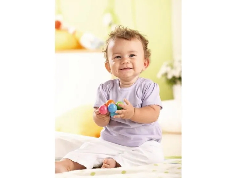 Der Greifring ist mit Speichelfesten Farben lackiert und animiert ihr Baby zum Entdecken, Fühlen und Zugreifen.
