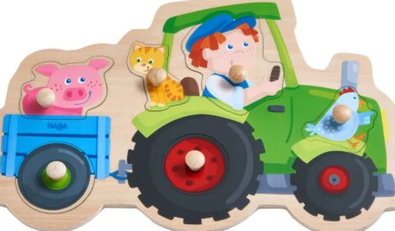 Was fehlt denn noch? Das fragt sich Bauer Ben bei dem HABA Greifpuzzle Lustige Traktorfahrt. Wer hilft ihm, die Räder an die richtige Stelle und das Schweinchen in den Anhänger zu setzen? Das Holzpuzzle nimmt Kinder ab 1 Jahr mit in die spannende Welt des Puzzelns. Dank der großen Griffe können kleine Hände die 6 Puzzleteile aus Holz bequem greifen und in die richtige Aussparung setzen. So trainieren junge Puzzler ihre Feinmotorik. Beim Zuordnen der Baby-Puzzle-Teile lernen die Kleinen die niedlichen Tiere zu benennen. Katze und Huhn möchten auch mit! Und los geht die lustige Traktorfahrt!