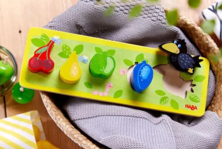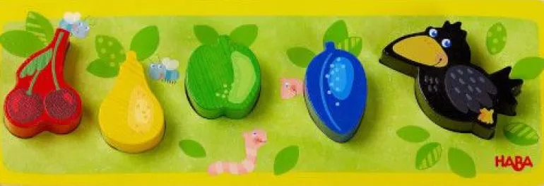 In welcher Reihenfolge vernascht der freche Rabe Theo das saftige Obst? Und wie heißen die leckeren Köstlichkeiten? Mit dem Holzpuzzle Obstgarten finden die Kleinsten dies spielerisch heraus und entwickeln dabei ganz nebenbei ein erstes Verständnis für Formen und Farben.