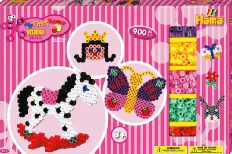 Geschenkpackung Maxi enthält ca. 900 Maxi-Perlen, die Stiftplatten Schmetterling und Schaukelpferd, Motiv-Vorlagen, Anleitung und Bügelpapier, sowie 2 Motivstützen. Ab 3 Jahren.