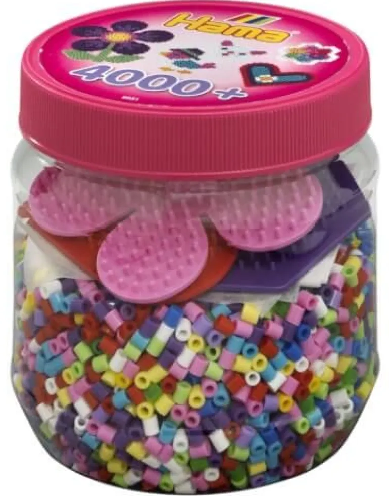HAMA Bügelperlen Dose mit 4.000 Perlen und den Stiftplatten kleines Sechseck, kleines Herz und kleine Blume. Ab 5 Jahren.