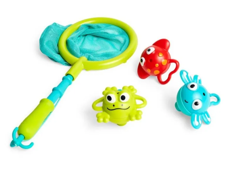 Beoachte, wie die Tiere aufspringen, wenn sie nach unten gedrückt werden. Benutze die Angel, um sie einzufangen und ins Netz zu legen.
