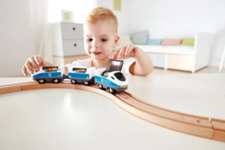 Alle einsteigen, bitte! Dieser Schnellzug hat Platz für einen Lokführer und mindestens einen Fahrgast mit Gepäck. Die Waggons werden von Magneten zusammengehalten. Warnsignale sorgen für Sicherheit.