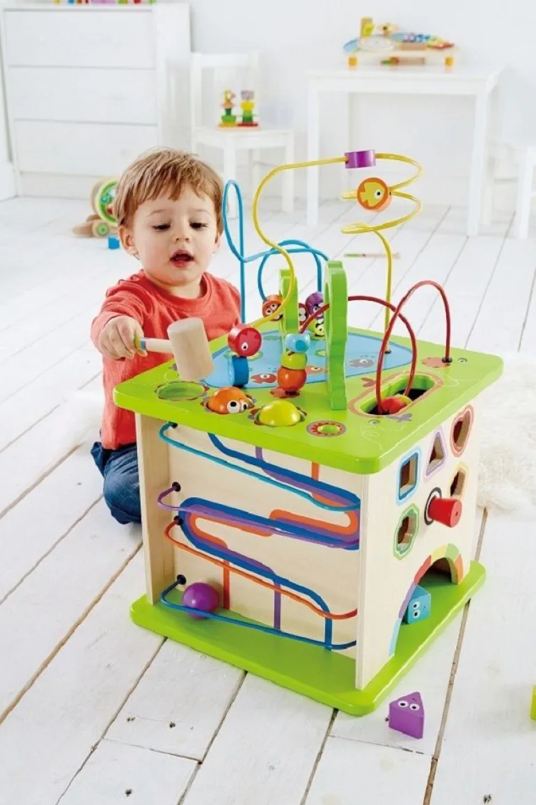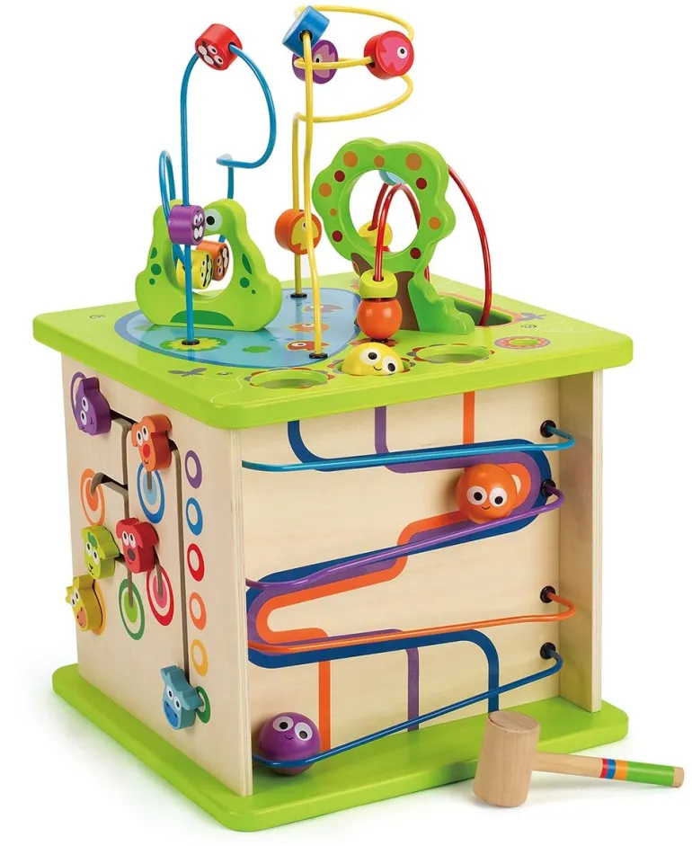 Motorikschleifen, Formen, Hebel und jede Menge fliegende, schwimmende und quakende Geschöpfe verwandeln dieses bunte, fünfseitige Spielcenter in eine Aktivitätenhochburg. Aus massivem Holz mit Wasserfarbe bemalt wird es viele Jahre lang für Spaß sorgen.