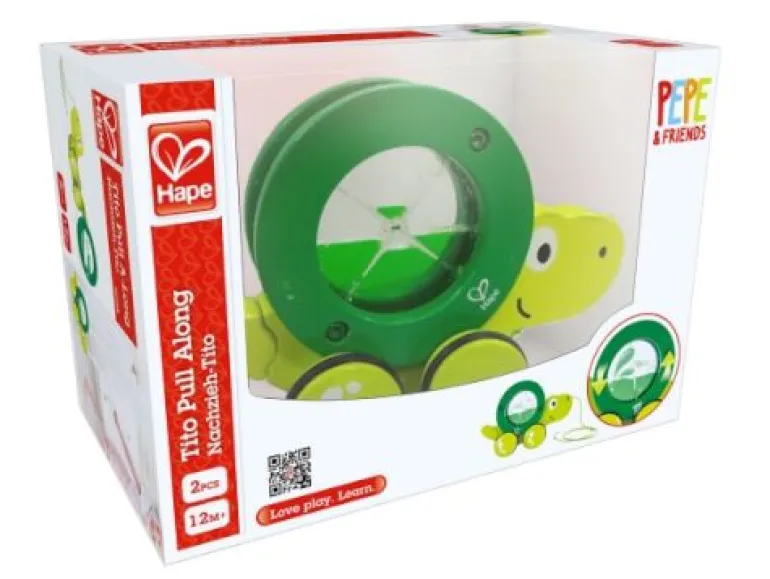 Die Schildkröte Tito bewegt sich gemächlich mit ihrem rollenden und herumwirbelnden Panzer. Das hilft beim Laufenlernen und Balancehalten.