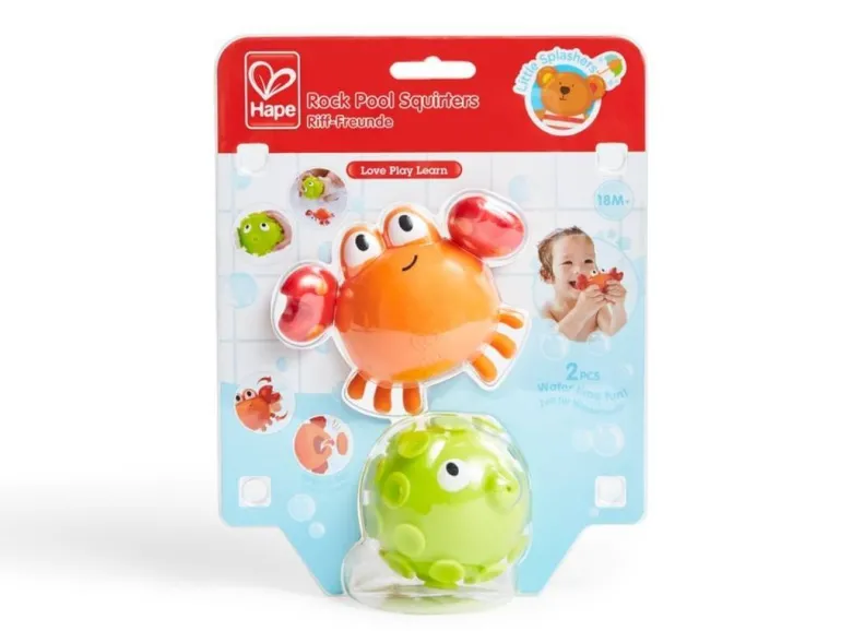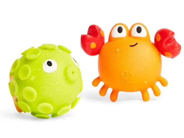 Diese niedliche Krabbe und der Fisch haben ein witziges Geheimnis! Wenn du sie mit Wasser füllst und zusammendrückst, schießen sie das Wasser wieder heraus. Sie bringen spritzigen Spaß in die Badewanne!