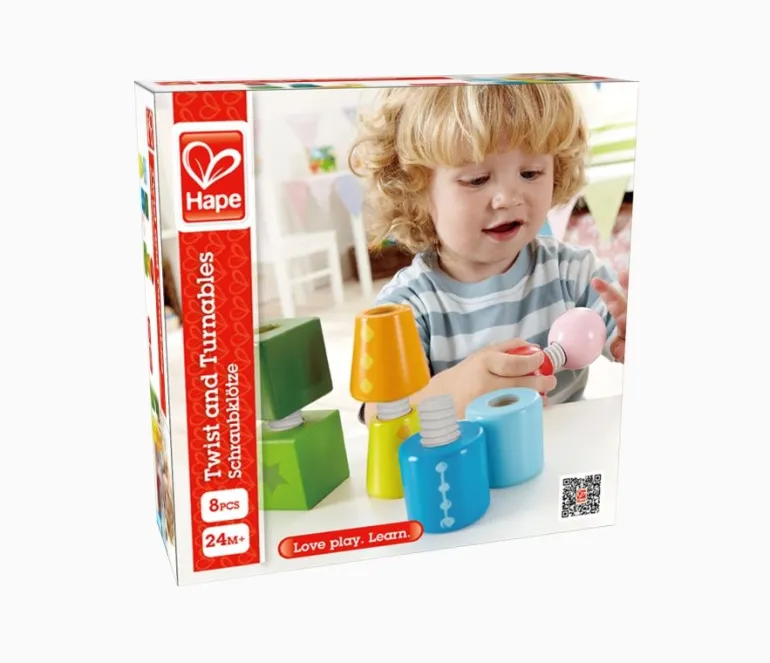 Diese bunt bedruckten Bauklötze bringen neuen Schwung ins Spiel. Sie lassen sich zusammenschrauben, sodass sie nicht herunterpurzeln können.