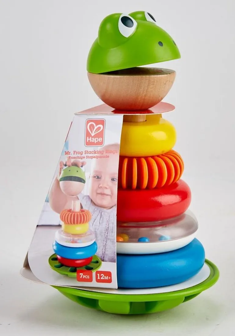 Mit dem Stapelfrosch lernen Kinder Farben und Größe zu unterscheiden. Die 5 farbigen Ringe lassen sich nach Belieben stapeln. Der Kopf des Frosches ist eine Klatsche.