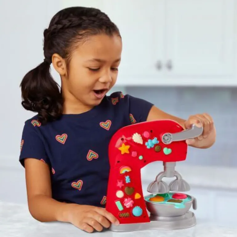 Mit der Knetspritze oder dem Teigschaber lassen sich exquisite Dekorationen hinzufügen und mit den Löchern am Griff des Teigschabers Streusel herstellen. Die Förmchen an der Seite der Küchenmaschine können außerdem dazu dienen, um Bonbons, Toppings und Dekorationen aus Play-Doh zu kreieren. Dieses Play-Doh Spielset enthält 284 g Spielknete in verschieden Farben und eignet sich prima als Beschäftigung oder als Geschenk für Kinder ab 3 Jahren, die Küchenspielzeug und Lebensmittel zum Spielen lieben. Hasbro, Play-Doh, and all related properties are trademarks of Hasbro.