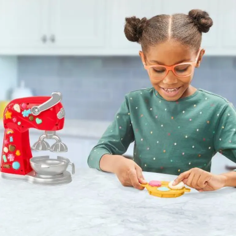 Mit der Super Küchenmaschine von Play-Doh Kitchen Creations können Kinder fantasievolle Kuchen, Cupcakes oder Plätzchen aus Knete zaubern. Kleine Konditoren können sich richtig ins Zeug legen, indem sie eines der 2 Play-Doh Tabletts mit Leckerli-Formen in die abnehmbare Schüssel geben und jede Form mit Play-Doh Spielknete füllen und dann ganz einfach den Hebel bewegen, um lustige Plätzchen und tolle Kuchenformen zu stempeln.