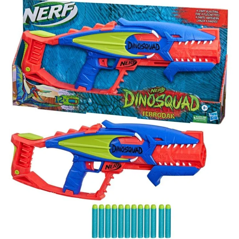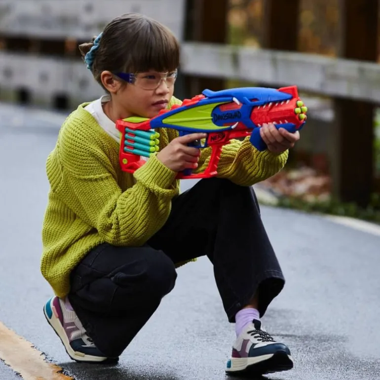 Als Mitglied der Elitetruppe DinoSquad verbünden sich Nerf Fans mit legendären Sauriern. Hier kann die außergewöhnliche Kraft der großartigsten Dinosaurier entfesselt werden, um sich in actionreiche Abenteuer zu stürzen. Mit dem Nerf DinoSquad Terrodak Blaster sind die Kinder bereit für coole Spiele im Freien.