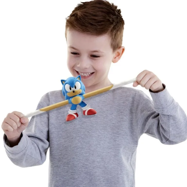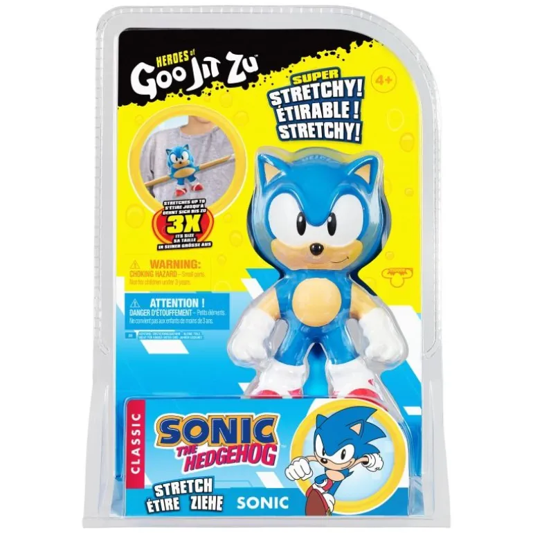 Begrüße den Neuzugang bei den Heroes of Goo Jit Zu – Sonic the Hedgehog! Er ist nicht nur superschnell, er ist auch superdehnbar! Das Abenteuer dehnt sich aus: Sonic hat den Sprung vom Bildschirm geradewegs in dein Kinderzimmer geschafft! Drücken, ziehen, dehnen – erlebe ausgedehnten Spielspaß wie nie zuvor! Schnapp dir seine Arme und Beine und ziehe daran. Wow! Er dehnt sich bis auf das Dreifache seiner Größe aus!