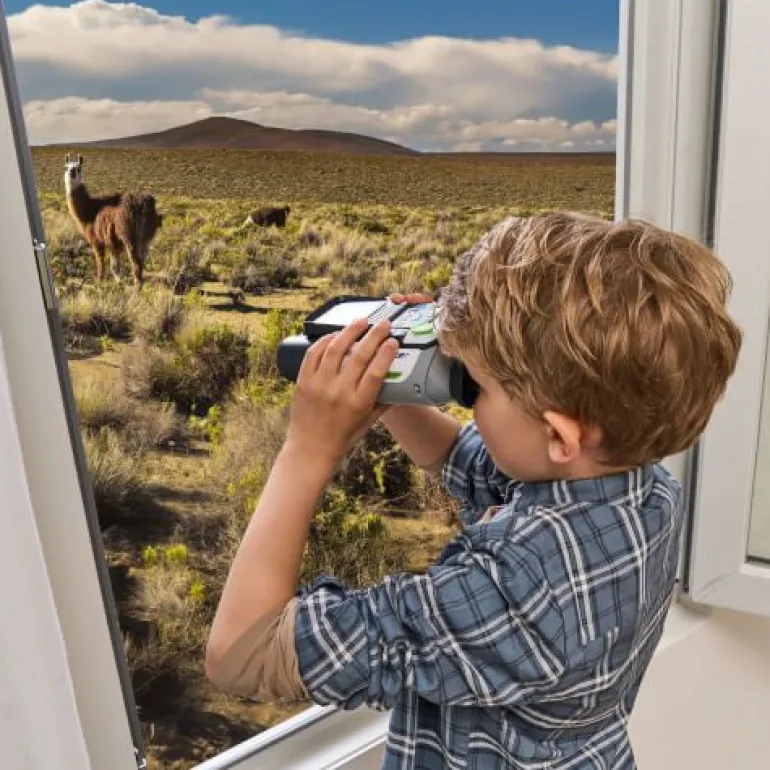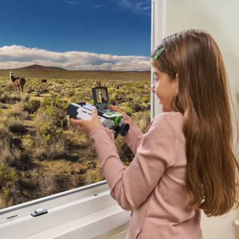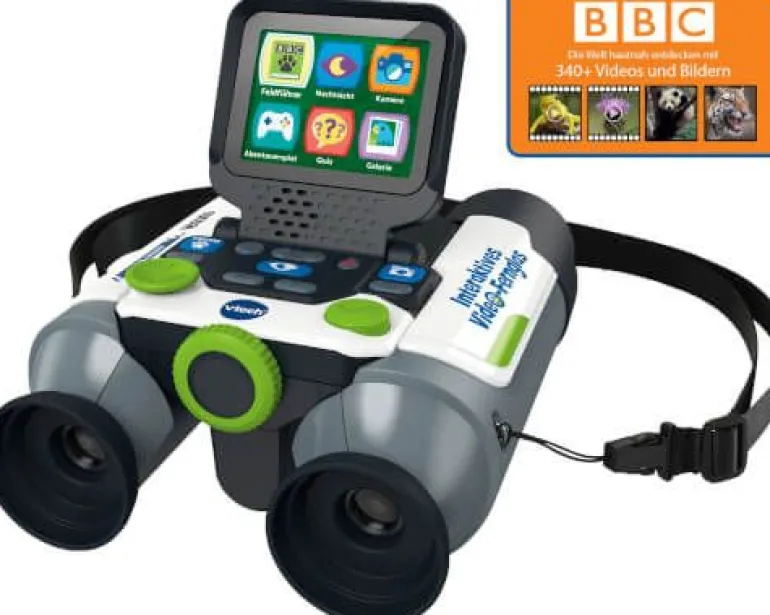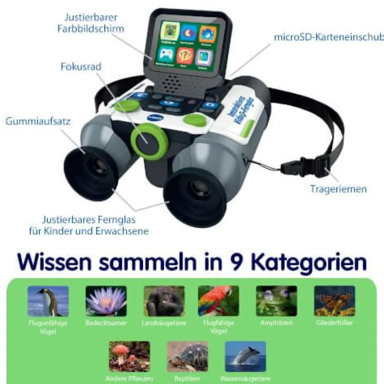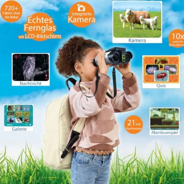 Lernspaß für draußen mit dem ersten eigenen Fernglas. Interaktives Fernglas mit Bildschirm und zahlreichen Funktionen und spannenden Inhalten. Mehr als 72 Themen, 700 Fakten, 360 Videos und Bilder von der BBC zu 9 Kategorien (Land-/Meeressäugetiere, flug(un)fähige Vögel, Amphibien, Reptilien, Arthropoda, Pflanzen, Pilze). 6 Spielmodi: Beobachten, Nachtmodus, Galerie, Entdeckungen bzw. Guide zu Flora und Fauna, Abenteuerspiel, Quiz. Doppelte Beobachtung dank Fernglas (mit justierbaren Zwischenabständen und weichen Gummiaufsätzen für komfortable Nutzung) und 2,4“-LCD-Farbbildschirm, welcher sich leicht auf-und wieder zuklappen lässt, damit er nicht stört -> Linsendurchmesser von 21 mm mit bis zu 10-facher Vergrößung und einem doppelten digitalen Zoom. Bildfunktion: die Entdeckungen lassen sich bildlich in der eigenen Galerie festhalten. Gläser lassen sich auf Entfernung anpassen zusätzlich lässt sich digital zoomen. 1 Steuerkreuz und 12 ergonomische Tasten. Micro-SD-Karteneinschub: Speicherkarte (nicht inkl.) einsetzen, um Speicherplatz zu erweitern. Mit Handschlaufe. Kindersicheres Batteriefach, Abschaltautomatik und Lautstärkeregler. Demobatterien sind enthalten.