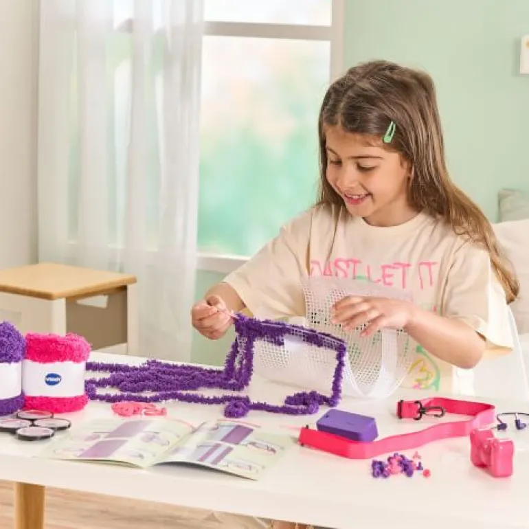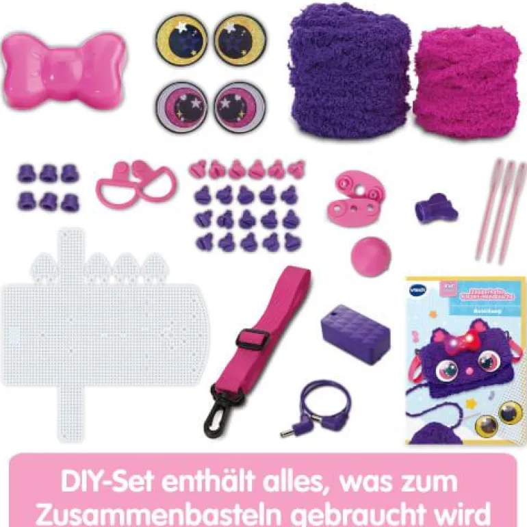 Kid´Couture Katzen-Handtasche – ein eigenes magisches Accessoire kreieren! Süßes Set mit dem eine eigene Katzen-Handtasche gewebt und gestaltet werden kann. Set enthält alles, was gebraucht wird: Flauschiges Garn in zwei Farben, Plastiknadeln, Gitterplanen aus Kunststoff für Tasche und Ohren, aufleuchtende Schleife uvm. Die glitzernden Augen (2 auswechselbare Augenpaare) und der Kunststoffverschluss können einfach mit Druckknöpfen befestigt werden. 11 zauberhafte Melodien, • 3 Spielmodi: – Lichterspaß: Touchsensoren lösen tolle Leuchteffekte aus – Musik: Touchsensoren lösen Musik- und Soundeffekte aus und es blinken passende Lichter – Bewegung: Touch- und Bewegungssensoren lösen Lichter, Musik und Geräusche aus und sorgen für magischen Strick- und Spielspaß Mit der DIY Katzentasche können Kinder nicht nur kreativ werden, sondern auch ihrer Fantasie freien Lauf lassen und die Feinmotorik schulen. Der verstellbare Nylonriemen lässt sich perfekt an die Größe der kleinen TrägerInnen anpassen. Kindersicheres Batteriefach, Abschaltautomatik und Lautstärkeregler. Demobatterien sind enthalten.