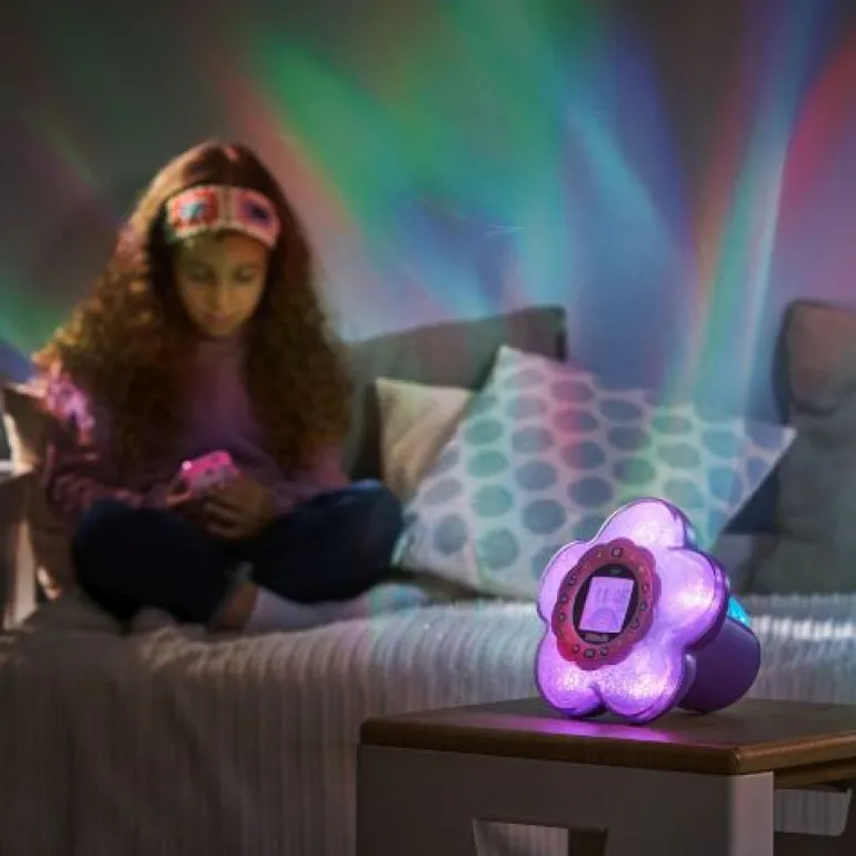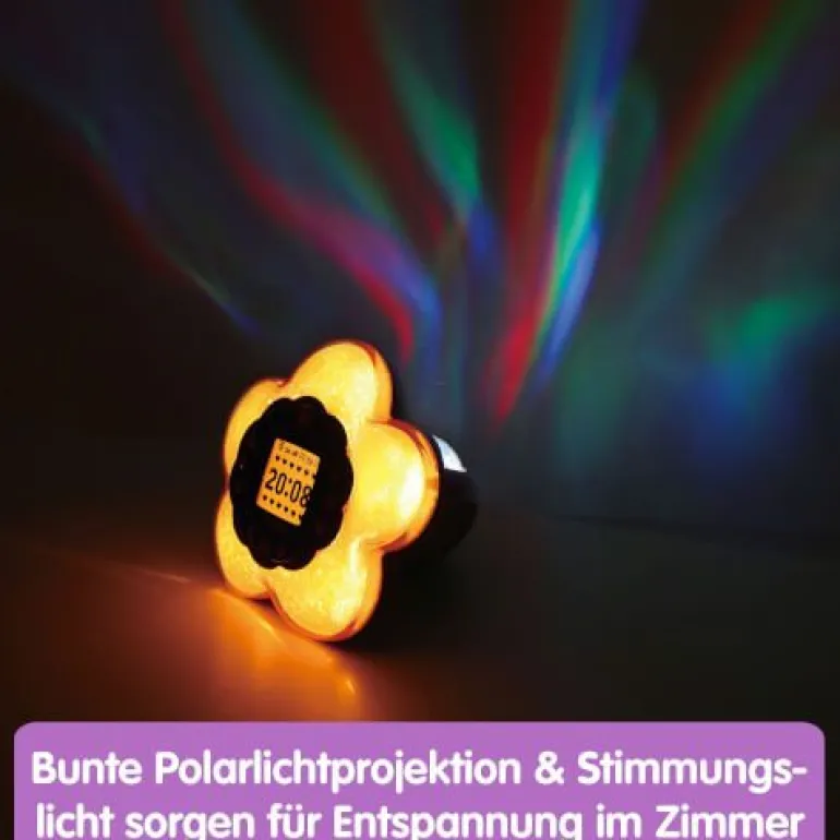 Blumiges Stimmungslicht mit funkelnden Projektionen und zauberhaften Spielen! Magischer Wecker mit farbenfrohen Lichtprojektionen und tollen Wahrsage-Funktionen sowie lustigen Spielen. 4 Spielmodi: Spiele & Einstellungen (4 vorinstallierte Spiele), Zauberhafte Aktivitäten (Wahrsagefunktion, Magischer Scanner, Gedankenlesen, Gefühlsstation, Herz polieren und Meditation), Musik und Radio. Mit strahlender Polarlichtprojektion und buntem Stimmungslicht. 15 digitale Ziffernblätter zur Auswahl. Lerninhalte: Hand-Auge-Koordination, Gedächtnis, Gefühle & Selbstbewusstsein, Musik und Atemtechnik. Bewegungsmelder zur Steuerung der Aktivitäten und zum Ändern der Lichtfarbe. Externen Musikplayer anschließen, um die eigene Lieblingsmusik zu hören (Audiokabel inkl.). Uhrzeitanzeige, gesprochene Zeitansage und Weckfunktion. LCD-Display mit einstellbarer Beleuchtung. 18 Melodien aus 3 Musikrichtungen (Entspannungs-, Disco- und Klassische Musik) sind bereits vorinstalliert. USB-Netzanschluss, Kindersicheres Batteriefach, Abschaltautomatik und Lautstärkeregler. Demobatterien sind enthalten.