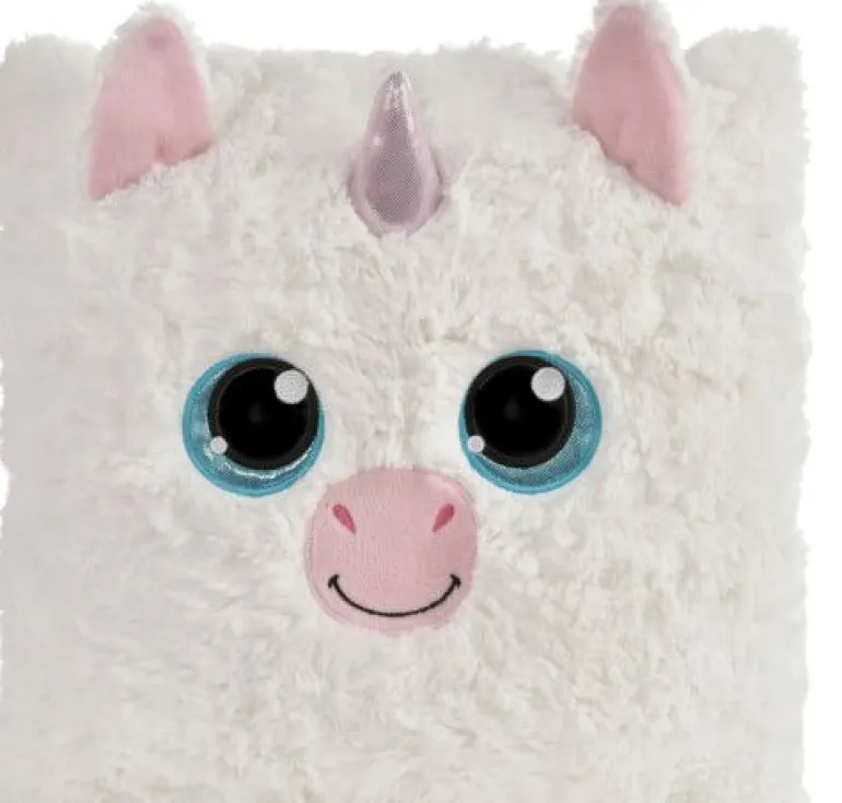 Das quadratische Plüschkissen GLUBSCHIS Einhorn Milky-Fee ist nicht nur flauschig weich, sondern begeistert mit einem bezaubernden Gesichtsausdruck, großen, blauen Glitzeraugen, einem rosa-glänzendem Stirnhorn und niedlichen kleinen Öhrchen in 3-D Optik.