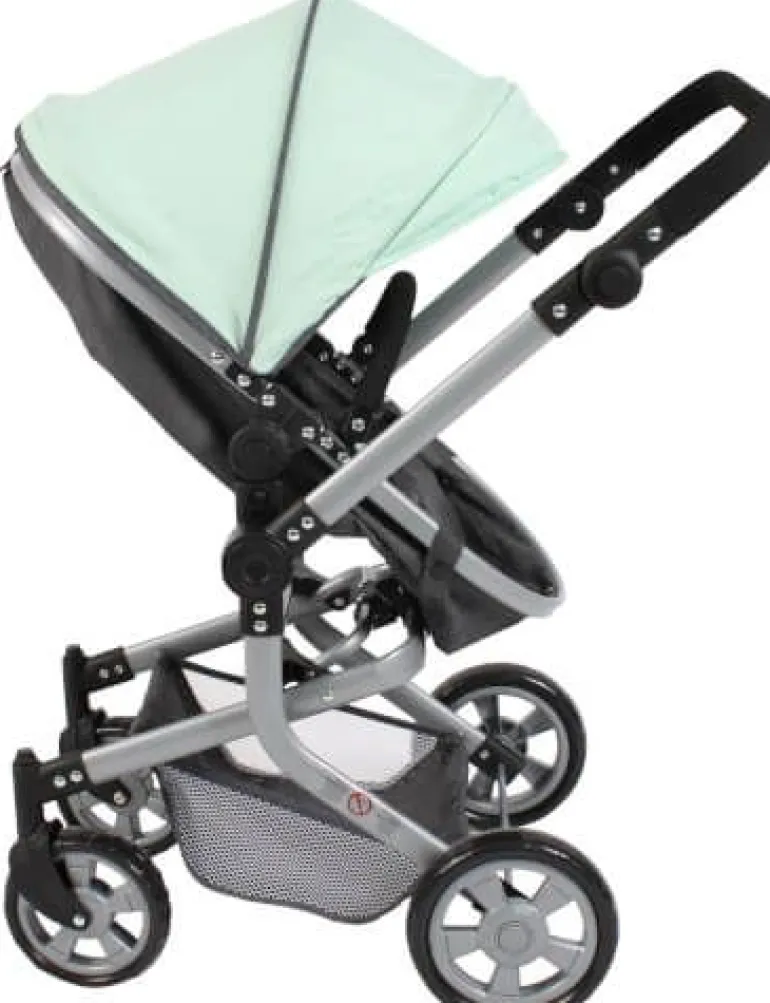 Topmodisch gestylter Kombi-Puppenwagen mit vielen praktischen Funktionen und schickem Gestell. Die schwenkbaren Vorderräder ermöglichen kinderleichtes Kurvenfahren. Der Sportsitz hat einen Sicherheitsbügel und lässt sich mit wenigen Handgriffen zum Wannenaufsatz mit ebener Liegefläche verwandeln. Die Abdeckung der Babywanne dient gleichzeitig als Winddecke für den Sportsitz. Der Sportsitz bzw. die Babywanne können beidseitig aufgesteckt werden, sowohl in Fahrtrichtung wie auch mit Blick zur Puppenmutti. Der Schiebegriff ist höhenverstellbar von ca. 47 bis 80 cm und passt sich so nahezu jeder Körpergröße an. Zudem lässt sich der Schieber schwenken, so dass der Puppenwagen von beiden Seiten aus gefahren werden kann. Mit Sonnenverdeck und Gepäcknetz für diverse Utensilien. Der Kombi Mika kann besonders einfach und klein zusammengeklappt werden. Für Puppen bis ca. 52 cm. Artikelmaße: 73 x 41 x 82 cm, Gewicht: 4 kg