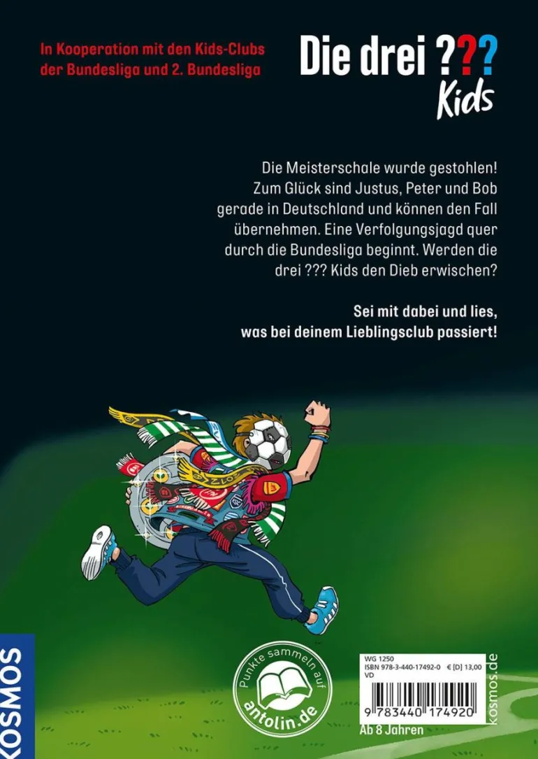 Justus, Peter und Bob machen gemeinsam mit Tante Mathilda und Onkel Titus eine Deutschlandreise. Dabei geraten sie mitten in einen Fall, der sie zu 27 Vereinen der Bundesliga führt: Die Meisterschale wurde gestohlen! Glücklicherweise sind Justus, Peter und Bob gerade vor Ort und können den Fall übernehmen. Der wahnsinnige Dieb jagt die drei ??? Kids quer durch die Bundesliga, vom Hamburger SV bis zum FC Bayern, von Eintracht Braunschweig bis zum VfB Stuttgart. In insgesamt 27 Fußballclubs müssen die Kult-Detektive vor Ort ermitteln. Werden sie den dreisten Dieb erwischen? Bundesliga club logos and DFL logos are protected trademarks of the respective clubs/organisations and are used with the kind permission of the respective owners. Manufactured under license from the DFL/Ligaverband in sole responsibility of Franckh-Kosmos Verlags-GmbH & Co. KG