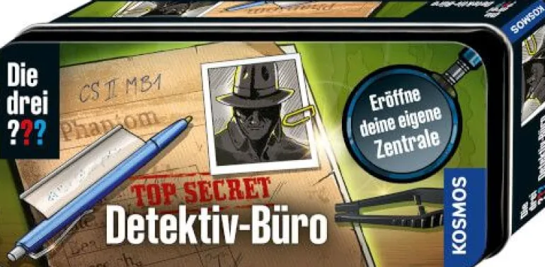 Jetzt werden alle Aufträge sofort bearbeitet! Mit dem Die drei ??? Detektivbüro richten sich Kinder ab 8 Jahren ihre erste eigene mobile Detektivzentrale ein. In der handlichen Metall-Stiftebox sind alle wichtigen Utensilien verstaut, die Nachwuchs-Detektive brauchen. In die Ferien, auf den Pausenhof oder zu Freunden – die komplette Ausstattung lässt sich zum Rollenspiel überall hin mitnehmen. Stehen die nächsten Ermittlungen an, einfach die Dose einpacken und mit Geheim-Kugelschreiber, Protokollblock, Absperrband, Stempel und Co. Tatort sichern, Beweise sammeln, Notizen aufschreiben und den Täter entlarven. Geniale Gadgets für angehende Super-Agenten und spannende Detektiv-Spiele!