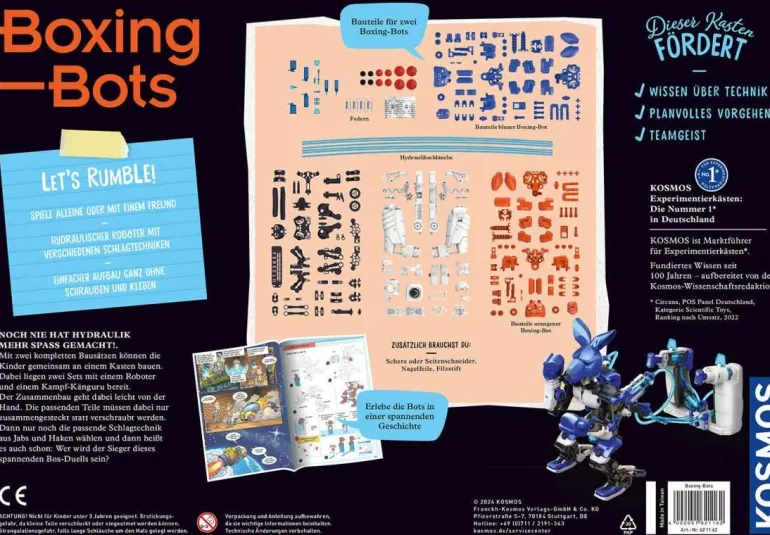 Hier geht’s um mehr als Boxen! Denn mit den Boxing Bots von KOSMOS wird Physik voller Action erlebbar. Die beiden im Experimentierkasten enthaltenen Roboter-Bausätze lassen sich ohne Schrauben zu zwei Bots zusammenbauen, die mit spektakulären Schlägen, Block- oder Ausweichmanövern im Ring gegeneinander antreten können. Dank der enthaltenen Punktezähler ist immer klar, wer gerade vorne liegt, und die Strategie der beiden SpielerInnen entscheidet über Sieg oder Niederlage. Das Besondere an den Bots: Sie kommen vollkommen ohne Batterien aus! Die Bedienung erfolgt über Joysticks, die die Bewegungen dank Hydraulik übertragen. So wird das Kinderzimmer zum physikalischen Boxring!