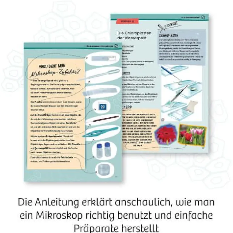 Dank der qualitativ hochwertigen Objektive, Okulare und Linsen ist eine bis zu 600fache Vergrößerung der Präparate möglich. Die bebilderte Anleitung beschreibt genau, wie das Einsteiger-Mikroskop richtig eingestellt, einfache Versuchsobjekte vorbereitet und unter Durchlicht untersucht werden.