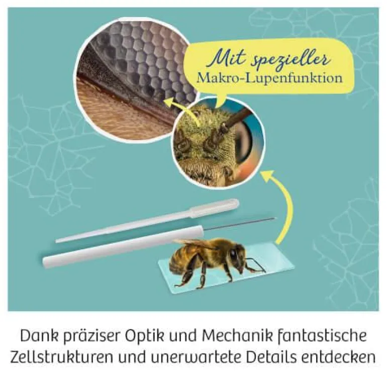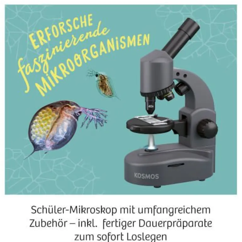 Fantastische Zellstrukturen und unerwartete Details kleinster Organismen – mit dem hochwertigen Schüler-Mikroskop von KOSMOS entdecken Kinder ab 10 Jahren eine Welt, die ihnen sonst verborgen bleibt. Die präzise Mechanik und die Qualitätslinsen ermöglichen ihnen ein optimales Scharfstellen der Objekte, was mit den Dauerpräparaten auch sofort ausprobiert werden kann. Doch richtig spannend wird es mit dem Herstellen eigener Präparate. Das Anleitungsheft des Experimentierkastens führt altersgerecht in die Techniken ein und schon nach kurzer Zeit fertigen die Kinder mit dem umfangreichen Zubehör einfache bis mittelschwere Präparate selbst her. Ein toller Zusatznutzen ist die spezielle Makro-Lupenfunktion des Mikroskops. Hiermit können größere Objekte wie Insektenflügel, Münzen und Mineralien im Auflicht betrachtet werden und faszinierende Oberflächenstrukturen werden sichtbar. Einfach zum Staunen, dieser Einstieg in die MINT-Wissenschaft Biologie.