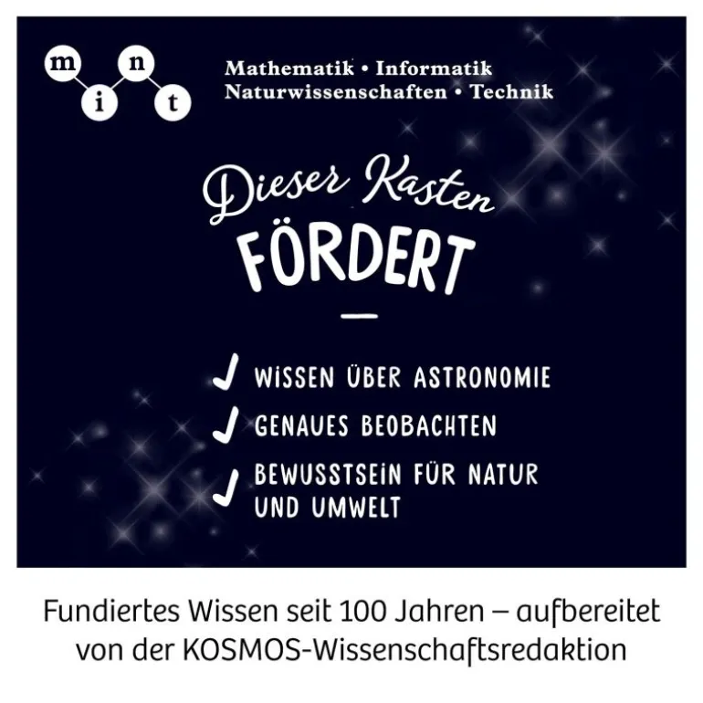 Was für ein Anblick, wenn die eigene Zimmerdecke zum Sternenhimmel wird – das Zimmer-Planetarium von KOSMOS macht’s möglich! Egal, ob Sternbilder, Planeten oder ferne Galaxien – dank der drei Sternkuppeln und 32 Weltraumbilder auf vier Bilderscheiben lässt sich das Universum ganz einfach im Kinderzimmer erkunden. Das Highlight: Die beiden Projektoren werfen mit ihren leuchtstarken LEDs gleich zwei Bilder an die Decke, so können die Kinder die Sternkarten mit den Weltraumobjekten immer wieder neu kombinieren.