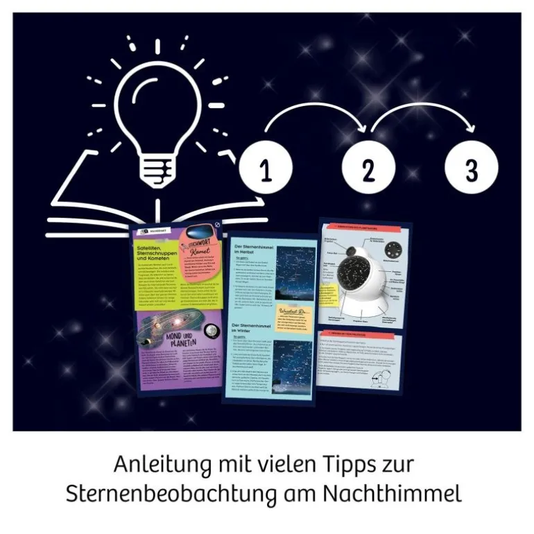 Die Anleitung erklärt astronomische Hintergründe zu Sternbildern und Objekten des Nachthimmels und bietet praktische Tipps für die Himmelsbeobachtung in freier Natur ein beigelegtes Erklärposter erläutert und benennt die Sternbilder und Himmelsobjekte der Bildscheiben. Besonders praktisch: ein integrierter Auto-Timer machen das Planetarium auch zum beruhigenden Nachtlicht und schaltet sich nach 15, 30 oder 60 Minuten automatisch ab.