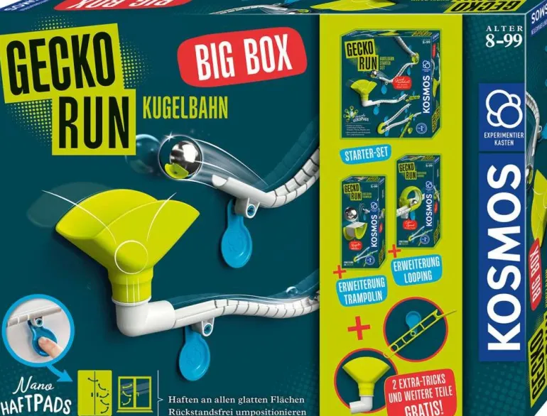 Das „Gecko Run Starter Set mit den rasanten Erweiterungen „Trampolin und „Looping und zwei Trick-Elementen zusätzlich in einer Box – so wird die ganze Wohnung zum Spielfeld! Mit den rückstandsfrei haftenden Nano-Haftpads werden die Bahnen ganz individuell an senkrechten, glatten Oberflächen befestigt und in Sekundenschnelle umgesetzt und feinjustiert. Welchen Effekt dabei die Gravitation auf ihre Kugel hat und wann sie besonders viel Speed sammelt, finden die Kinder dabei ganz allein heraus.