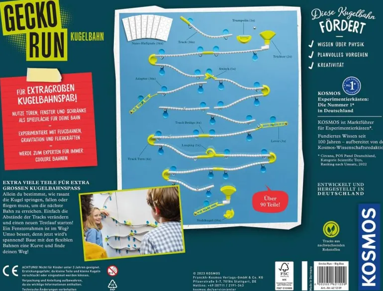 Ob über Hindernisse hinweg, ob an Türen, Glasscheiben, Fliesen oder Regalen – mit der Kugelbahn von KOSMOS kann so flexibel gebaut werden wie noch nie! Nachhaltig: Alle Tracks bestehen aus nachwachsenden Rohstoffen und die Kugelbahn wird in Deutschland hergestellt. Für Kinder ab acht Jahren.