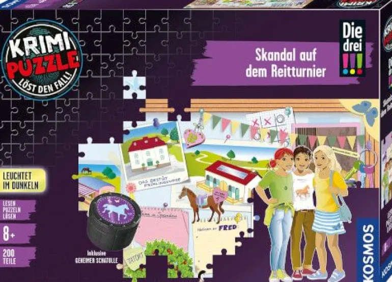 Die beiliegende Kurzgeschichte führt sie mitten in einen spannenden Fall. Puzzleteil für Puzzleteil finden die Ermittlerinnen und Ermittler wichtige Hinweise, mit denen sie dem Täter auf die Spur kommen. Geniales Extra: eie rätselhafte Geheim-Schatulle in dem sich ein wichtiges Indiz befindet! Können die Kinder alle Hinweise richtig kombinieren und den Fall lösen? Cool: das fertige Puzzle aus 200 Teilen leuchtet im Dunkeln!