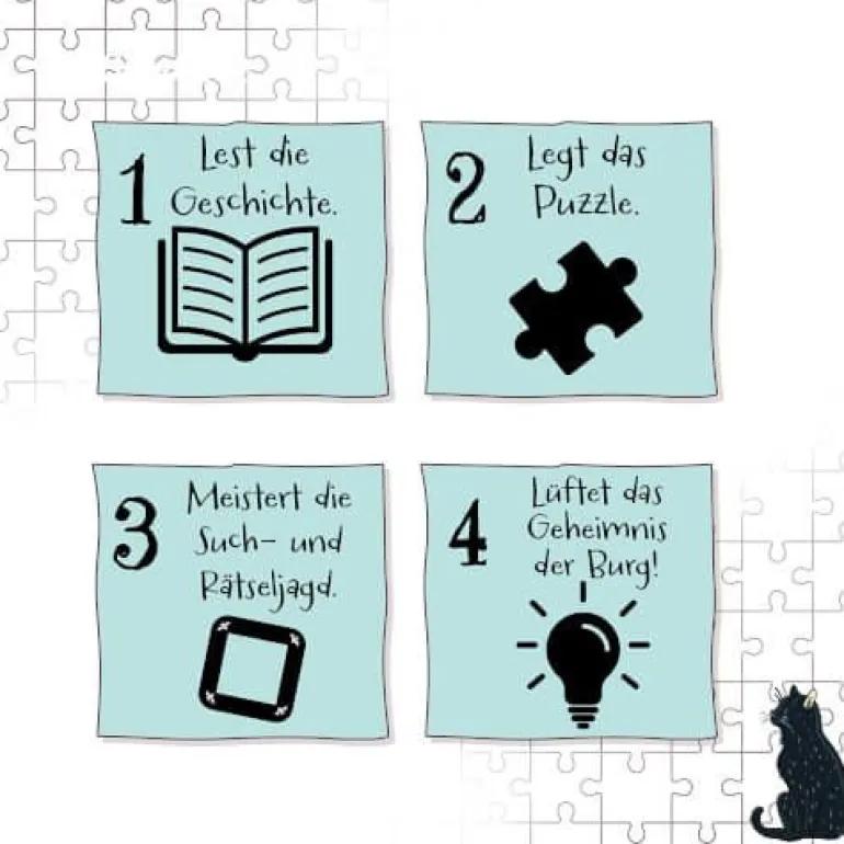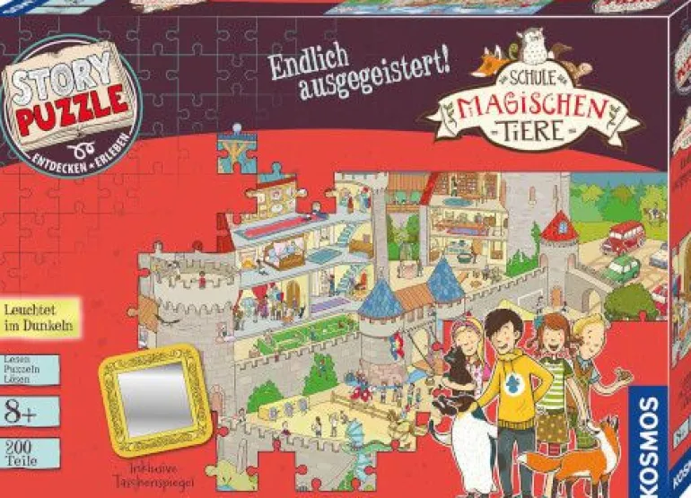 Was wie eine harmlose Klassenfahrt zu einer oberbayerischen Burg beginnt, entwickelt sich in diesem Story Puzzle nach und nach zu einem aufregenden Abenteuer für die Klasse von Miss Cornfield. Denn irgendetwas stimmt da nicht! Treibt in diesem uralten Gemäuer etwa ein Geist sein Unwesen? Gemeinsam mit den berühmten magischen Tieren machen sich Kinder ab 8 Jahren auf eine spannende Erkundungstour. Um das Geheimnis der Ritterburg zu lüften, wird zuerst die exklusive Kurzgeschichte gelesen. Dann wird das kunterbunte Wimmelbild zusammengepuzzelt, auf dem mit Hilfe der Anleitung Schritt für Schritt die Rätsel der Burg entdeckt werden. Hier sind Spürnasen gefragt, denn einige der Rätsel können nur mit dem beiliegenden Taschenspiegel gelöst werden. Abgerundet wird dieses aufregende und geheimnisvolle Puzzle-Erlebnis aus der Reihe #Die Schule der magischen Tiere von Margit Auer durch den genialen Effekt von Leuchtfarbe, die das Bild im Dunklen zum Strahlen bringt.