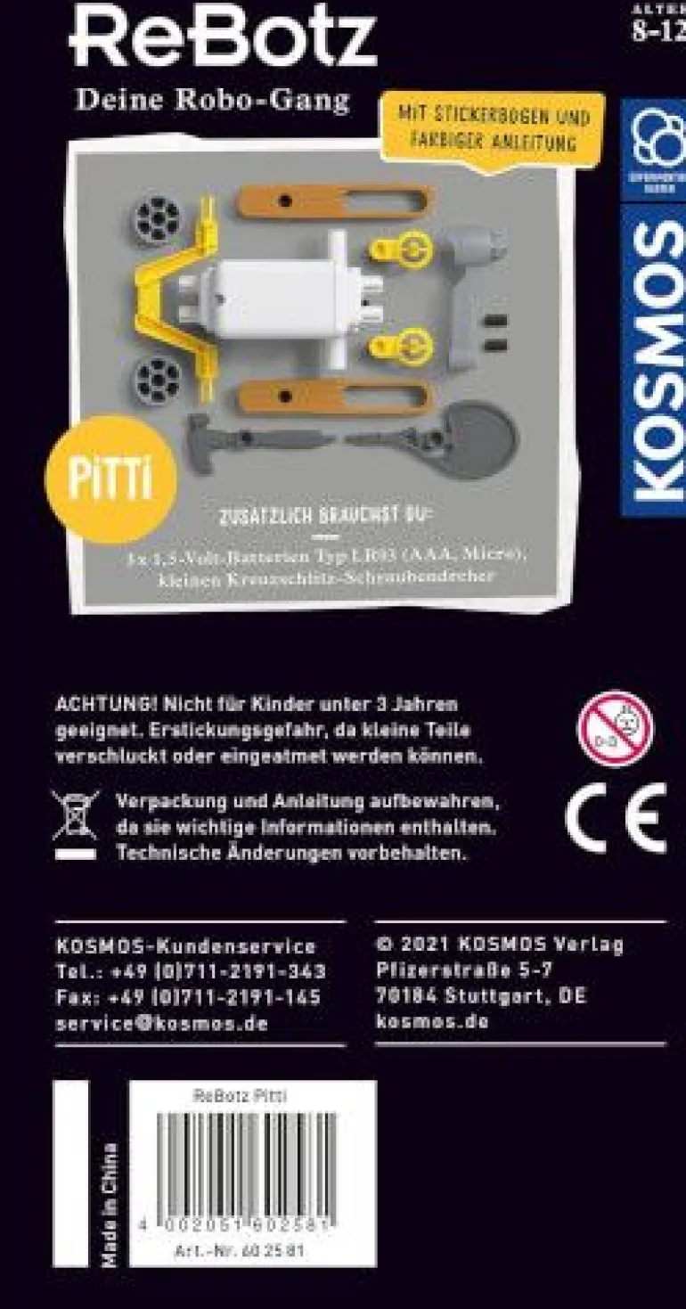 Hinterher! Dieser kleine Roboter ist einfach nicht zu stoppen. Nur wenige Handgriffe liegen zwischen den einzelnen Bauteilen und dem lustigen ReBot, der für Partystimmung im Kinderzimmer sorgt. Schnell die beiden Räder, den Tennisschläger, den Hammer und den Motor zusammenfügen, mit coolen Stickern bekleben # Batterie einlegen und los gehts!