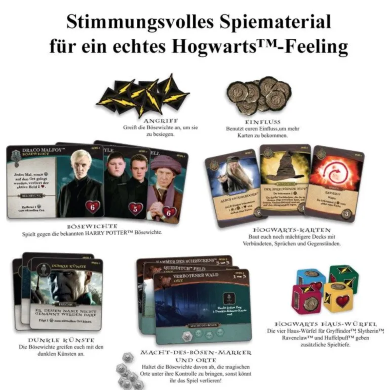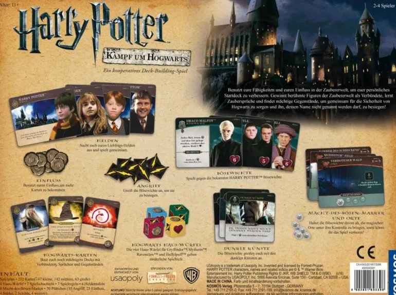 In dem kooperativen Deck-Building-Game „Harry Potter™ – Kampf um Hogwarts™“ versuchen 2–4 Spieler die Zauberschule gegen Lord Voldemort™ zu verteidigen. Dafür schlüpfen sie in die Rollen der Helden Harry, Hermine, Ron und Neville in sieben Spielrunden. Jeder Spieler erhält ein eigenes Kartendeck, das zu seiner Figur passt. Mit diesen Spielkarten bauen sie ihren Einfluss durch Zaubersprüche, magische Gegenstände und Verbündete aus, die ihnen in ihrem Kampf gegen die dunklen Künste helfen. Um erfolgreich das Böse zu bekämpfen, kommt es in diesem Gesellschaftsspiel vor allem auf die Kraft des Teams an. Mit „Harry Potter™ – Kampf um Hogwarts™“ lassen sich die spannenden Abenteuer rund um die Winkelgasse™, die Kammer des Schreckens™, Quidditch™ und Co. zu Hause erleben!