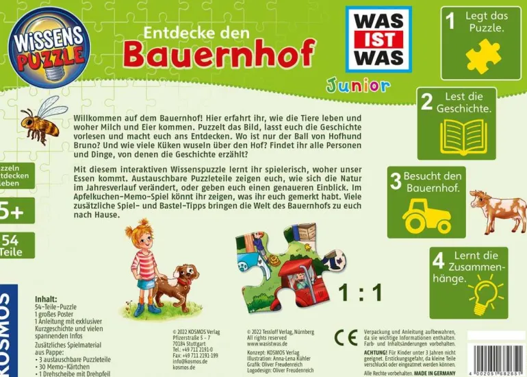 Pferde, Kühe und Schafe: Welche Tiere leben auf dem Bauernhof und woher kommen eigentlich Milch und Mehl? Puzzeln und entdecken! Eine kleine Geschichte bringt Kinder mitten hinein in die Welt des Bauernhofs. Als nächstes ist das Wimmelbild-Puzzle an der Reihe. Mit kurzen Sachtexten zum Vor- oder später auch zum Selbstlesen und kleinen Spielideen lernen Kinder ab 5 Jahren diesen besonderen Ort kennen. Die Anleitung gibt zusätzliche Informationen zu Themen wie zum Beispiel Jahreszeiten und neue Spiel-Ideen rund um das Puzzlebild. Quizfragen und Suchspiele rufen spielerisch Wissen ab und trainieren die Konzentration. Zusätzliche Ideen wie ein Rezept und Entdecker-Spiele in der Natur garantieren noch mehr Spaß: Lust auf Urlaub auf dem Bauernhof?
