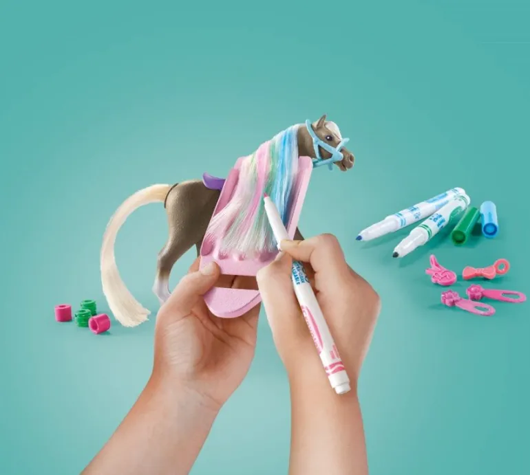 Für fantasievolle Pferdefans: Nachhaltiges Horses of Waterfall-Kreativset Pferd mit Stiften zum Bemalen der Mähne. Inklusive einer PLAYMOBIL-Figur, einem Pferd und drei CRAYOLA Stiften mit abwaschbarer Farbe.