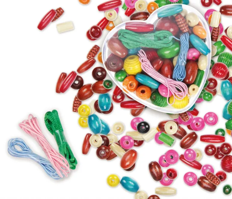 Bunte Holzperlen in verschiedenen Formen, in hübscher Kunststoffdosen in Herzform. Ab 4 Jahren.