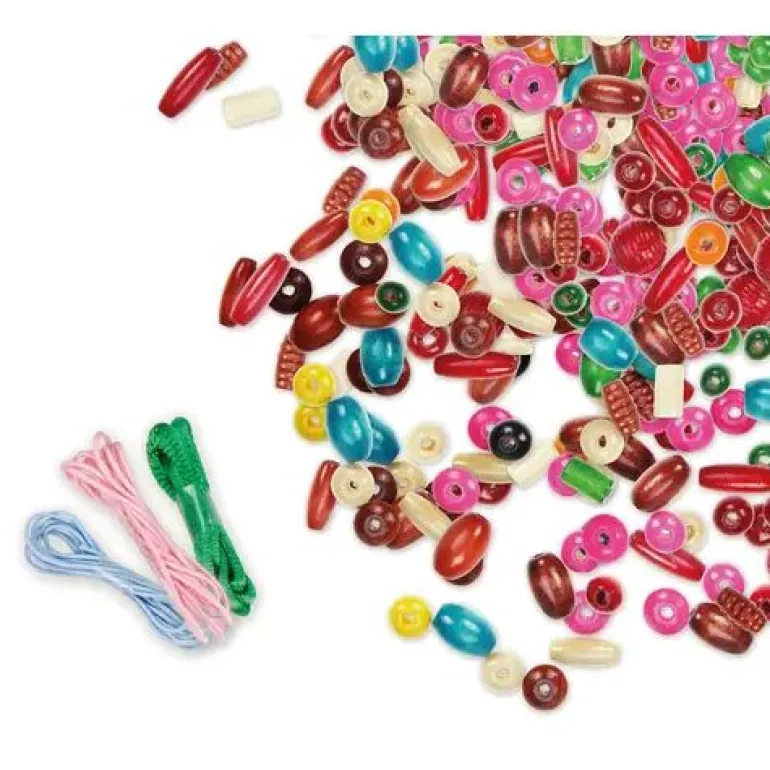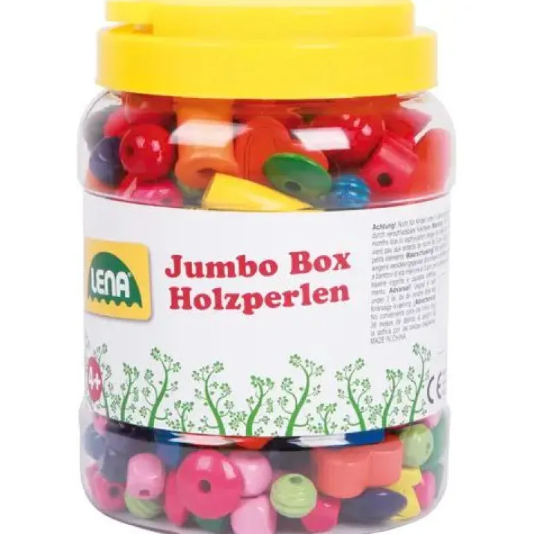 LENA® Jumbo Box Holzperlen bestehend aus bunten Holzperlen und Fädelschnüren.